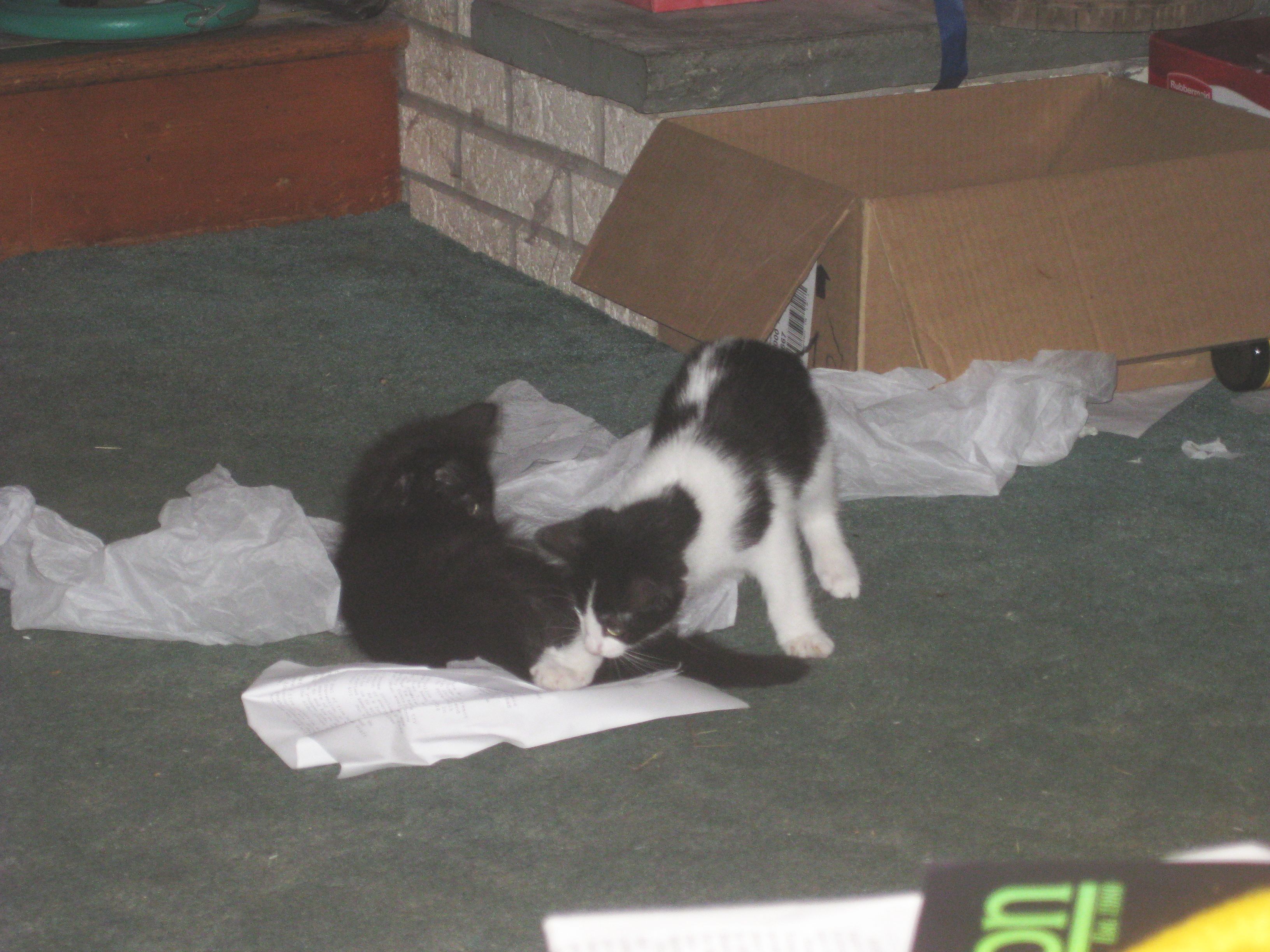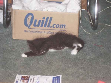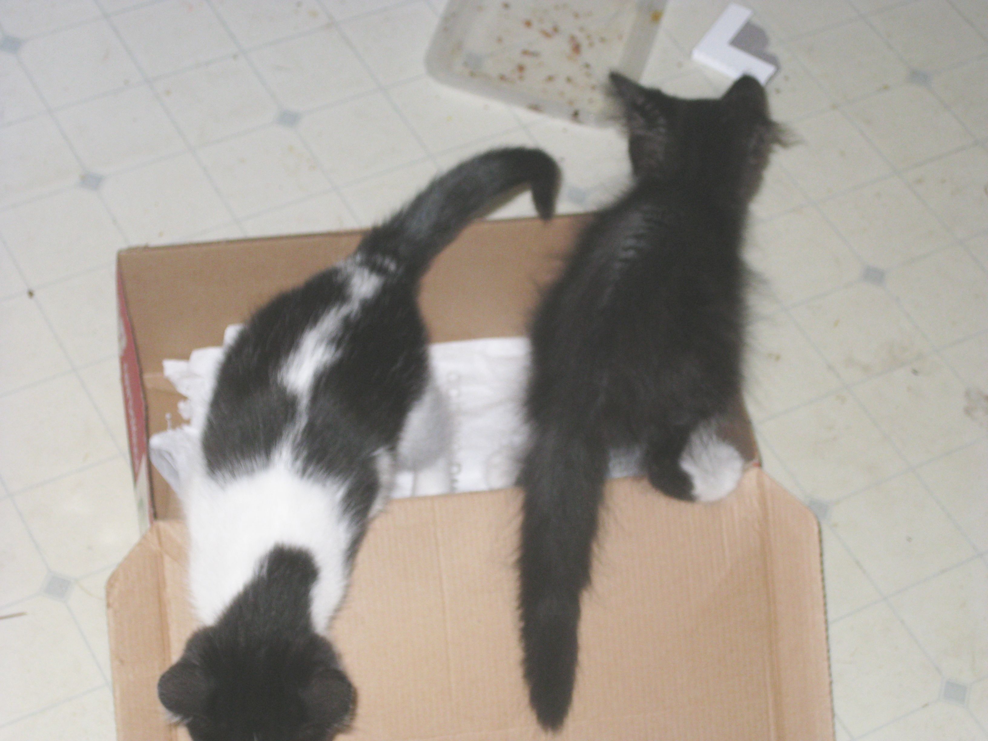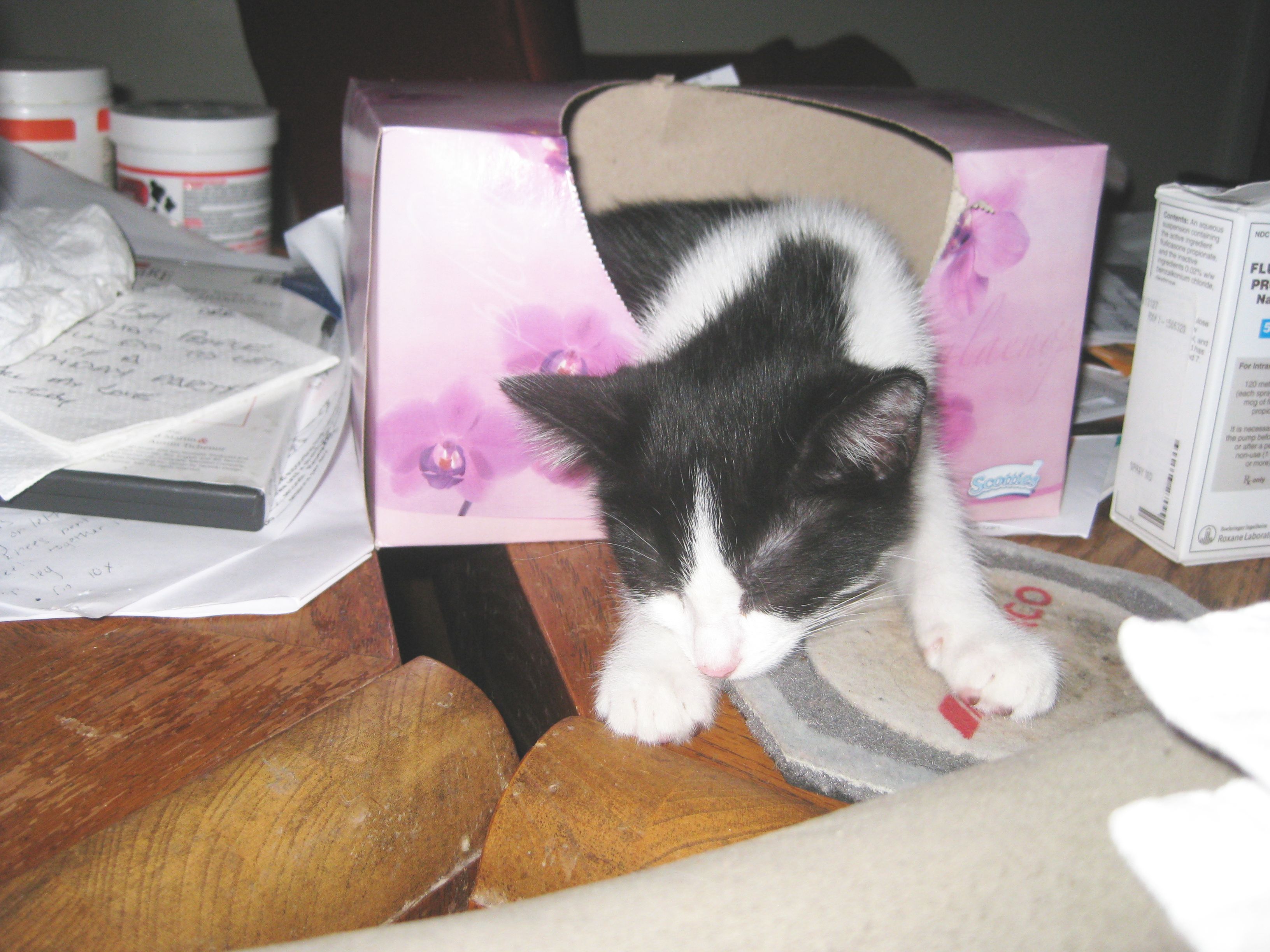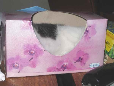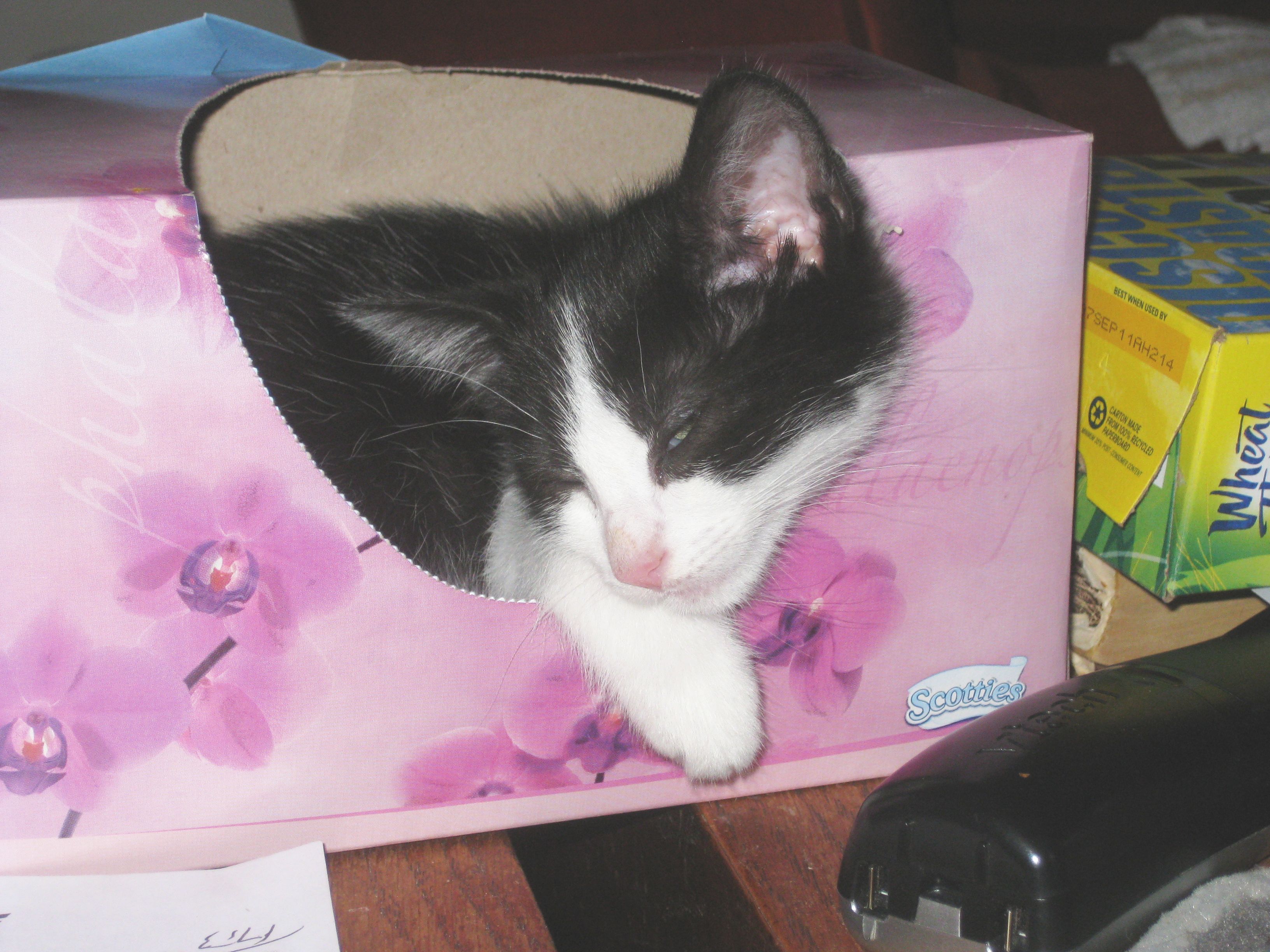 Selma is the, mostly, black cat. She was the "runt" of the litter. They are litter mates. Selma has pretty much lost the "halo" of LONG fur, though you can still see in some of the pictures!! Pips has a lot more white, including a "SKUNK" stripe down her back! As she got older she decided that playing, and sleeping, in the tissue box wasn't enough, she pushed onto the floor and removed all the tissues! She's now to big to fit inside the box.