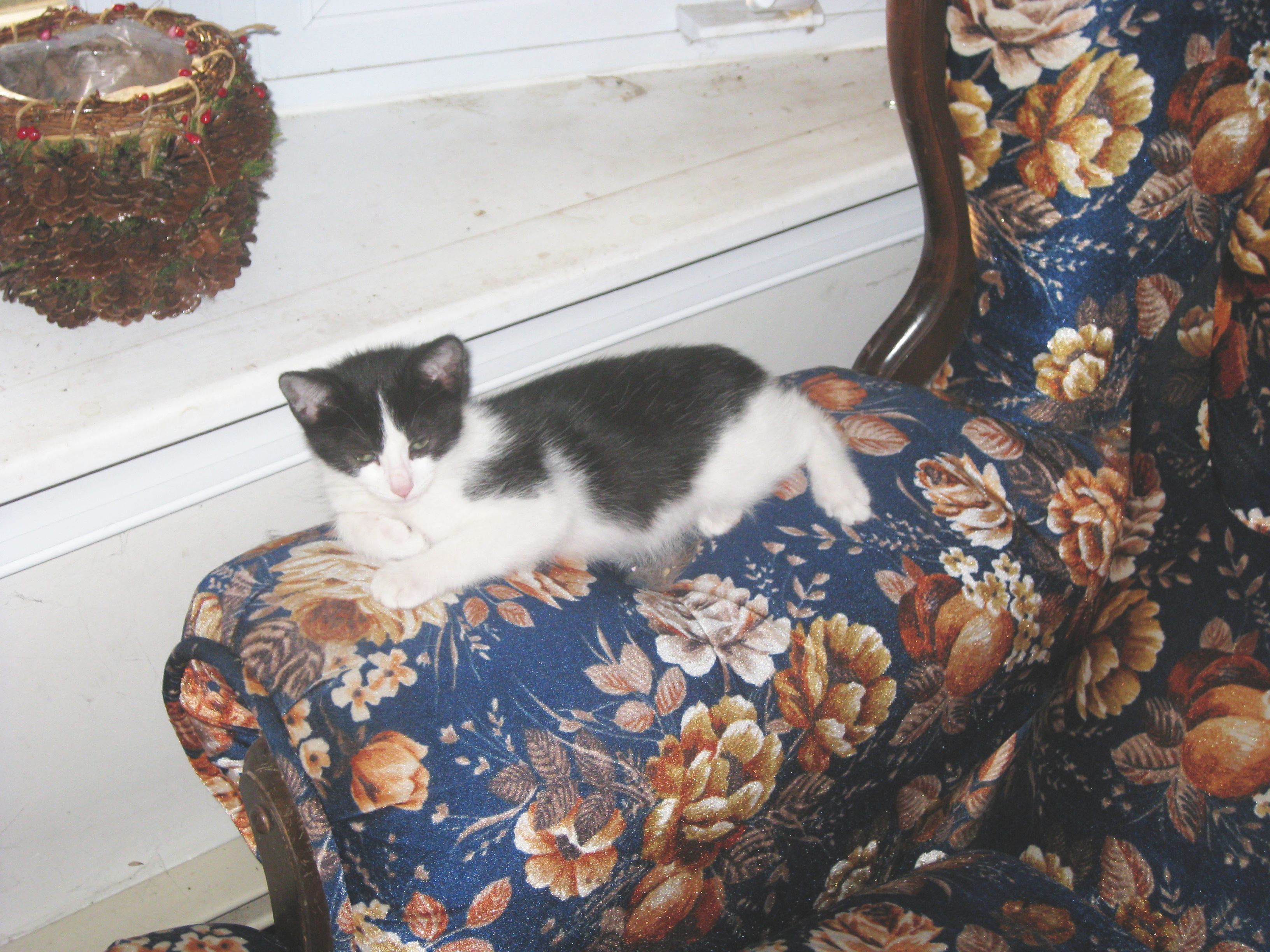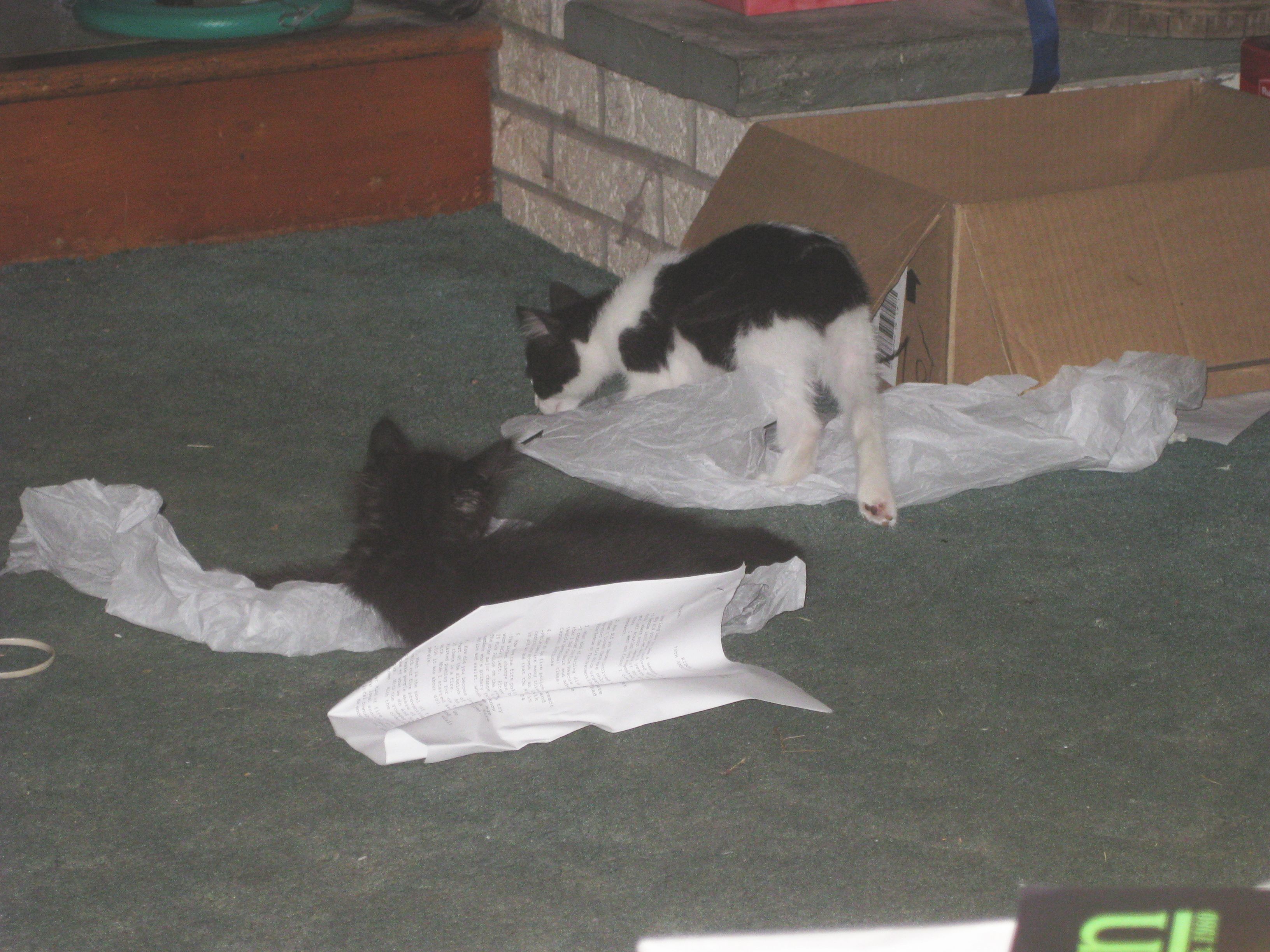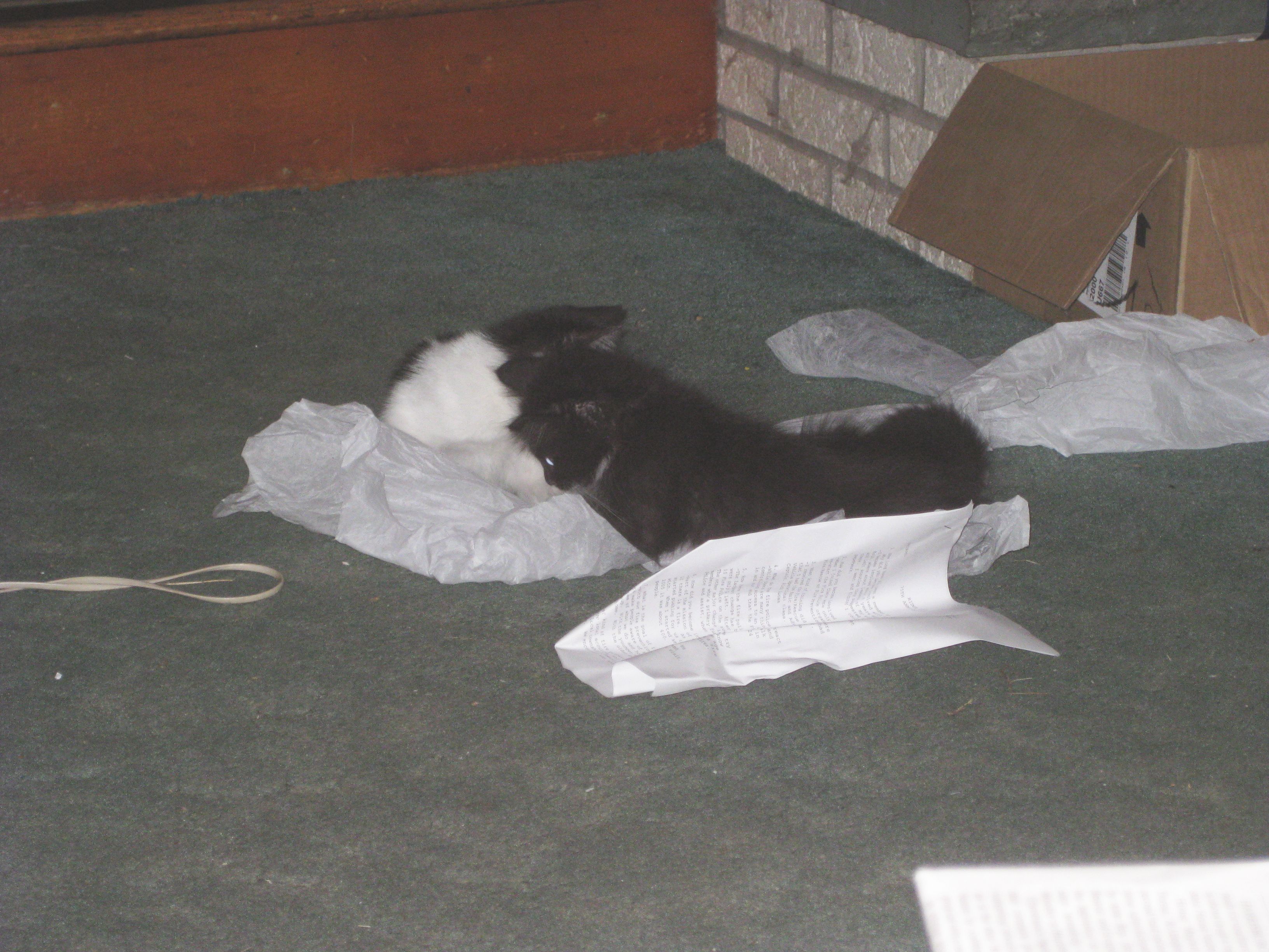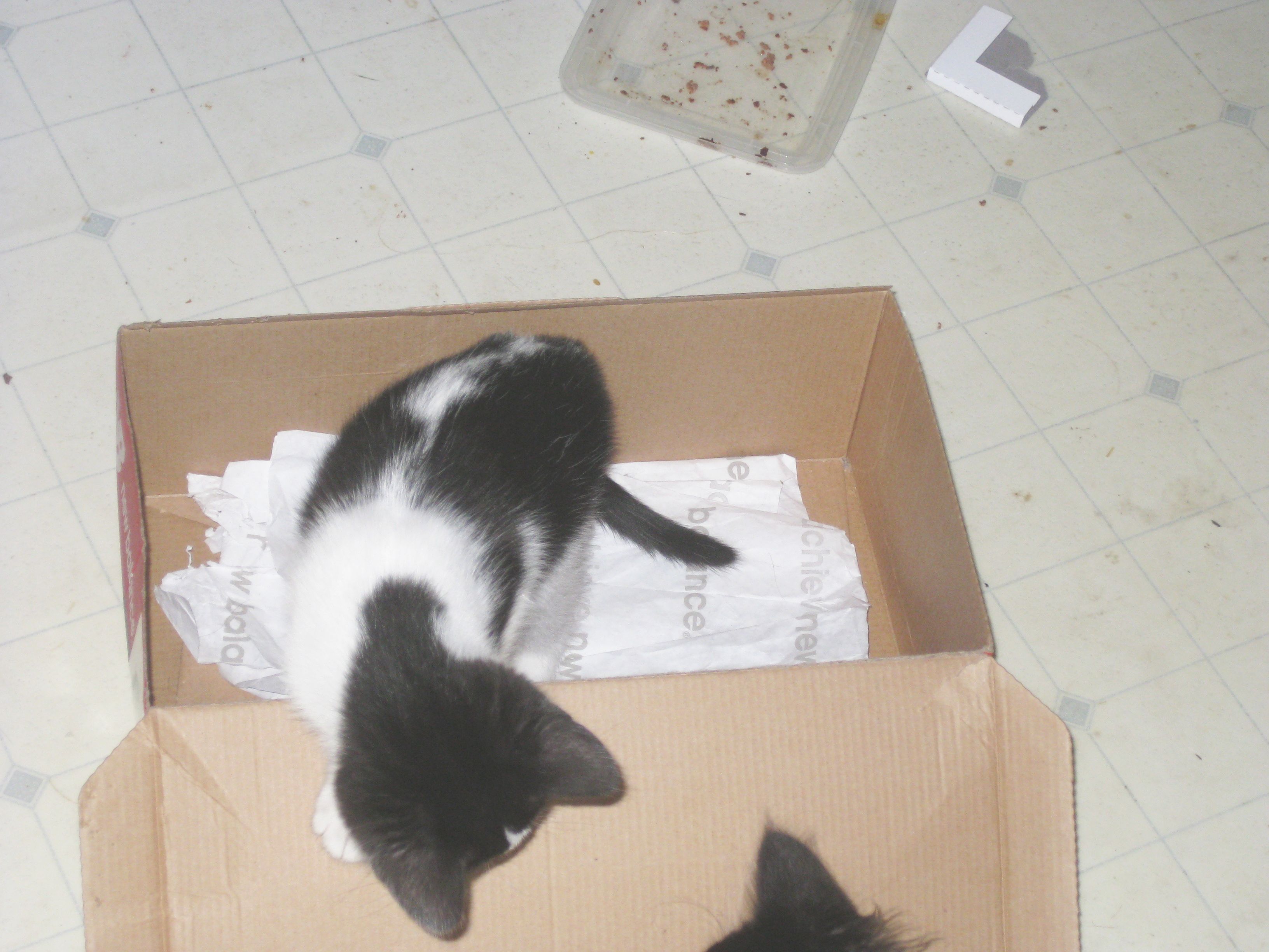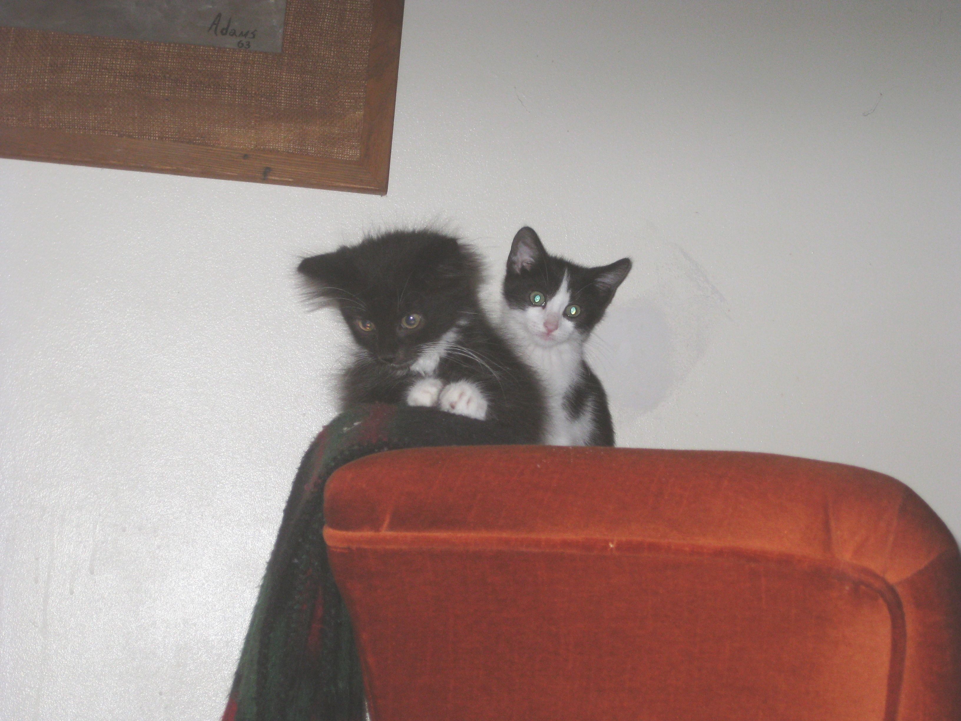 Selma is the, mostly, black cat. She was the "runt" of the litter. They are litter mates. Selma has pretty much lost the "halo" of LONG fur, though you can still see in some of the pictures!! Pips has a lot more white, including a "SKUNK" stripe down her back! As she got older she decided that playing, and sleeping, in the tissue box wasn't enough, she pushed onto the floor and removed all the tissues! She's now to big to fit inside the box.