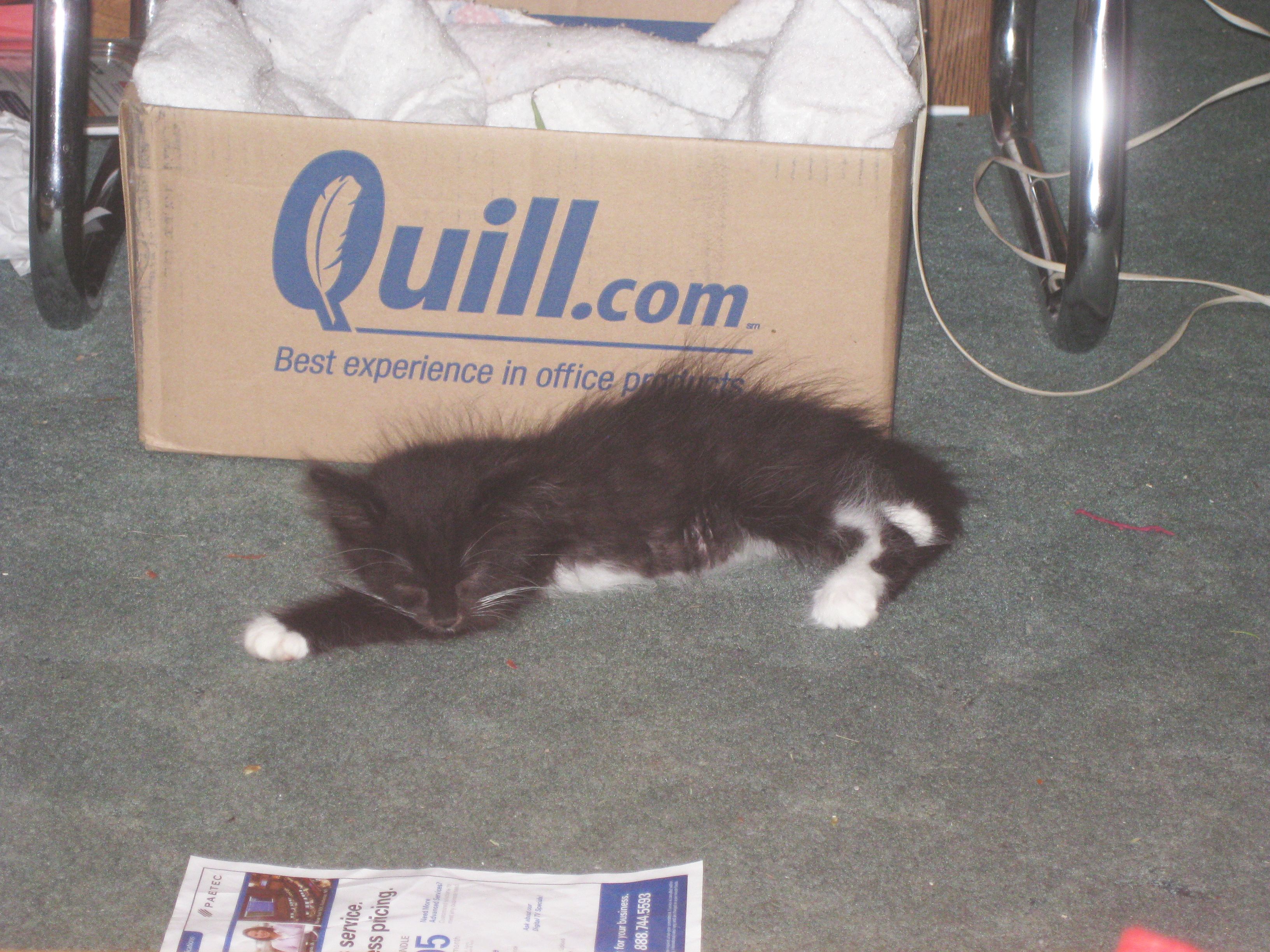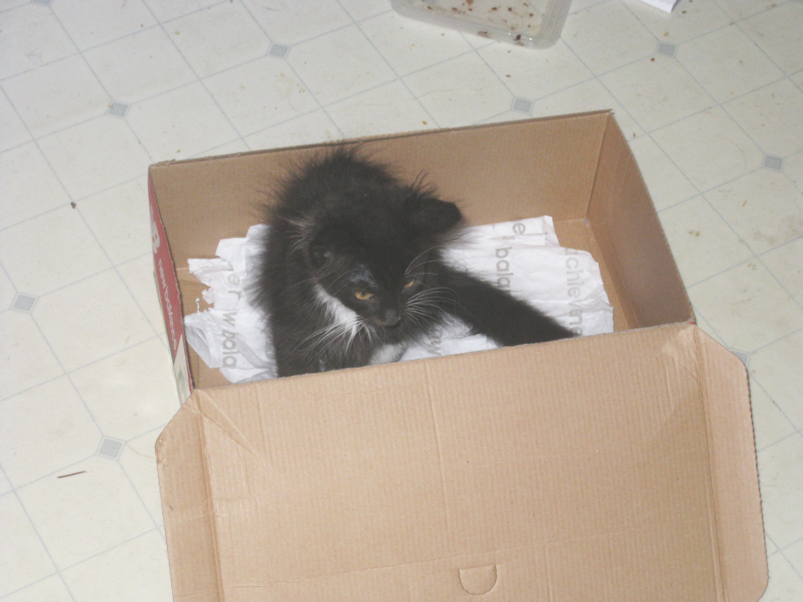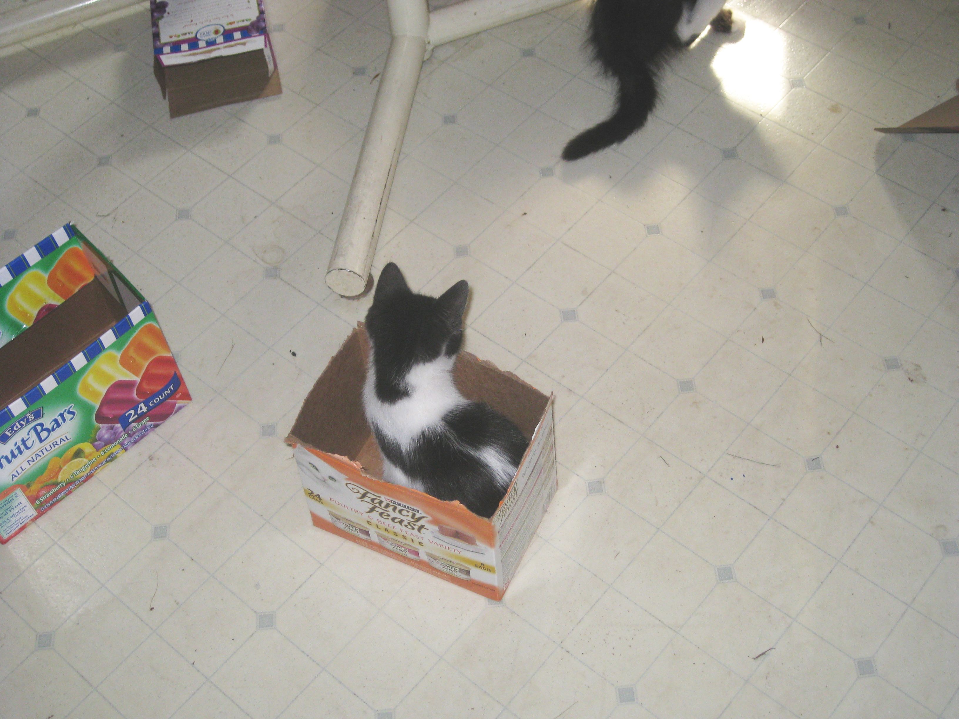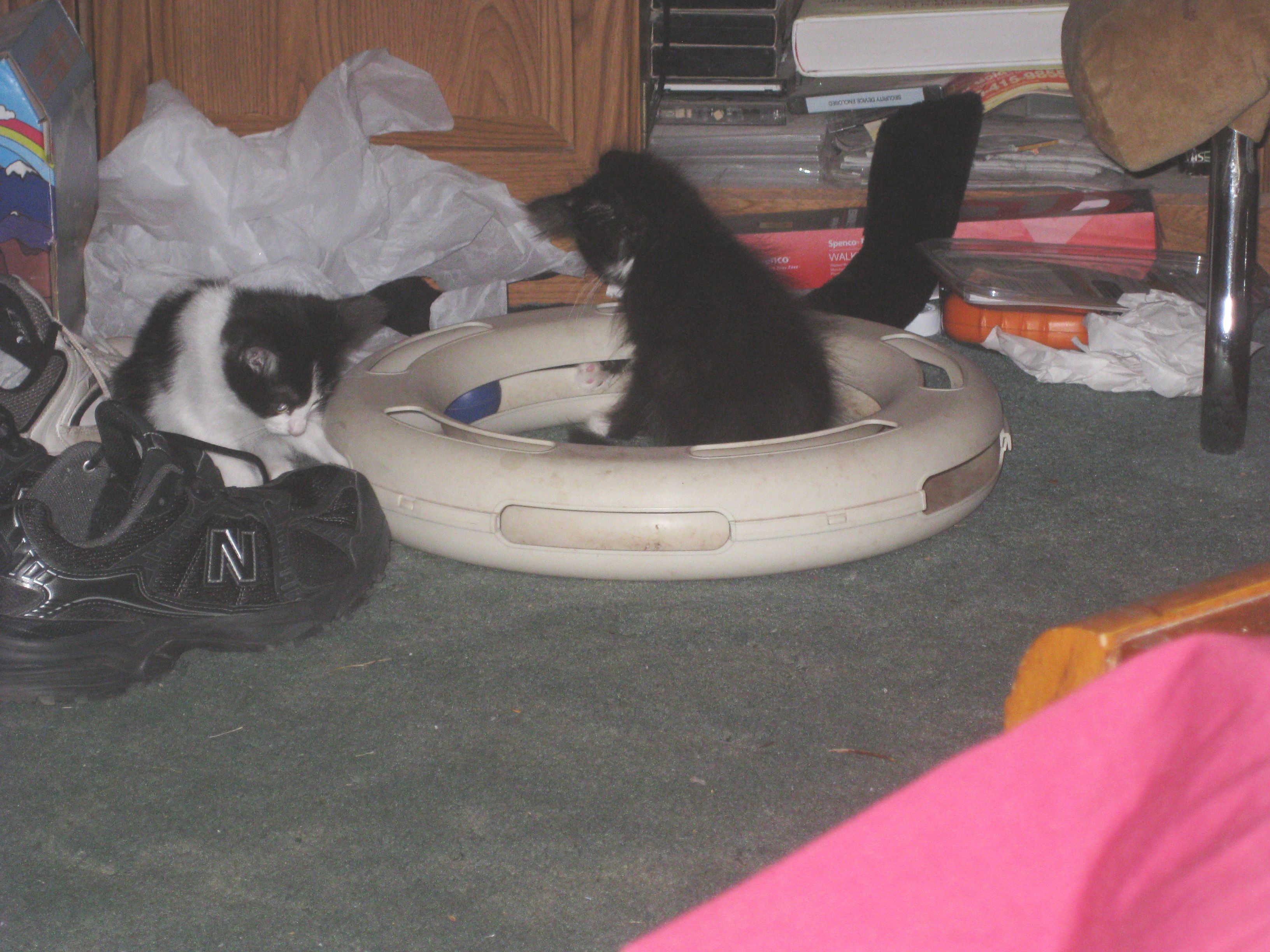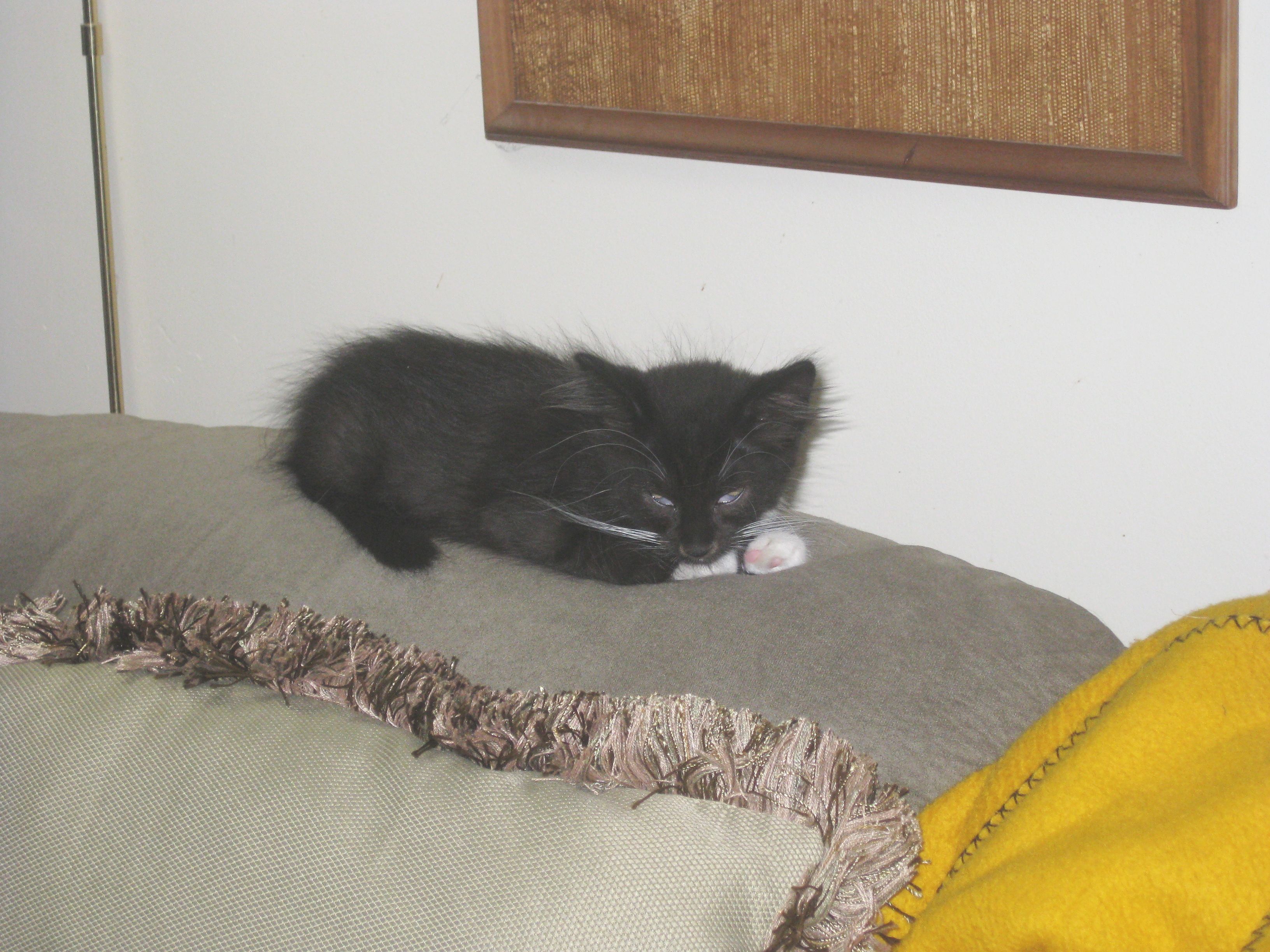 Selma is the, mostly, black cat. She was the "runt" of the litter. They are litter mates. Selma has pretty much lost the "halo" of LONG fur, though you can still see in some of the pictures!! Pips has a lot more white, including a "SKUNK" stripe down her back! As she got older she decided that playing, and sleeping, in the tissue box wasn't enough, she pushed onto the floor and removed all the tissues! She's now to big to fit inside the box.