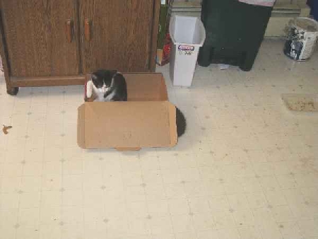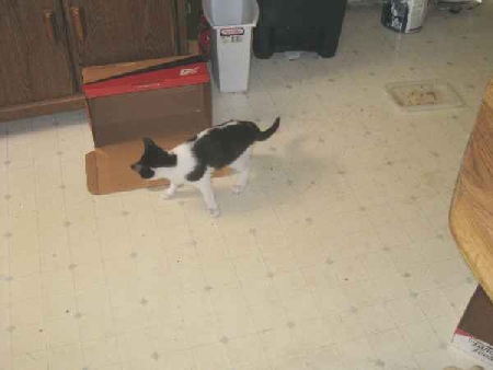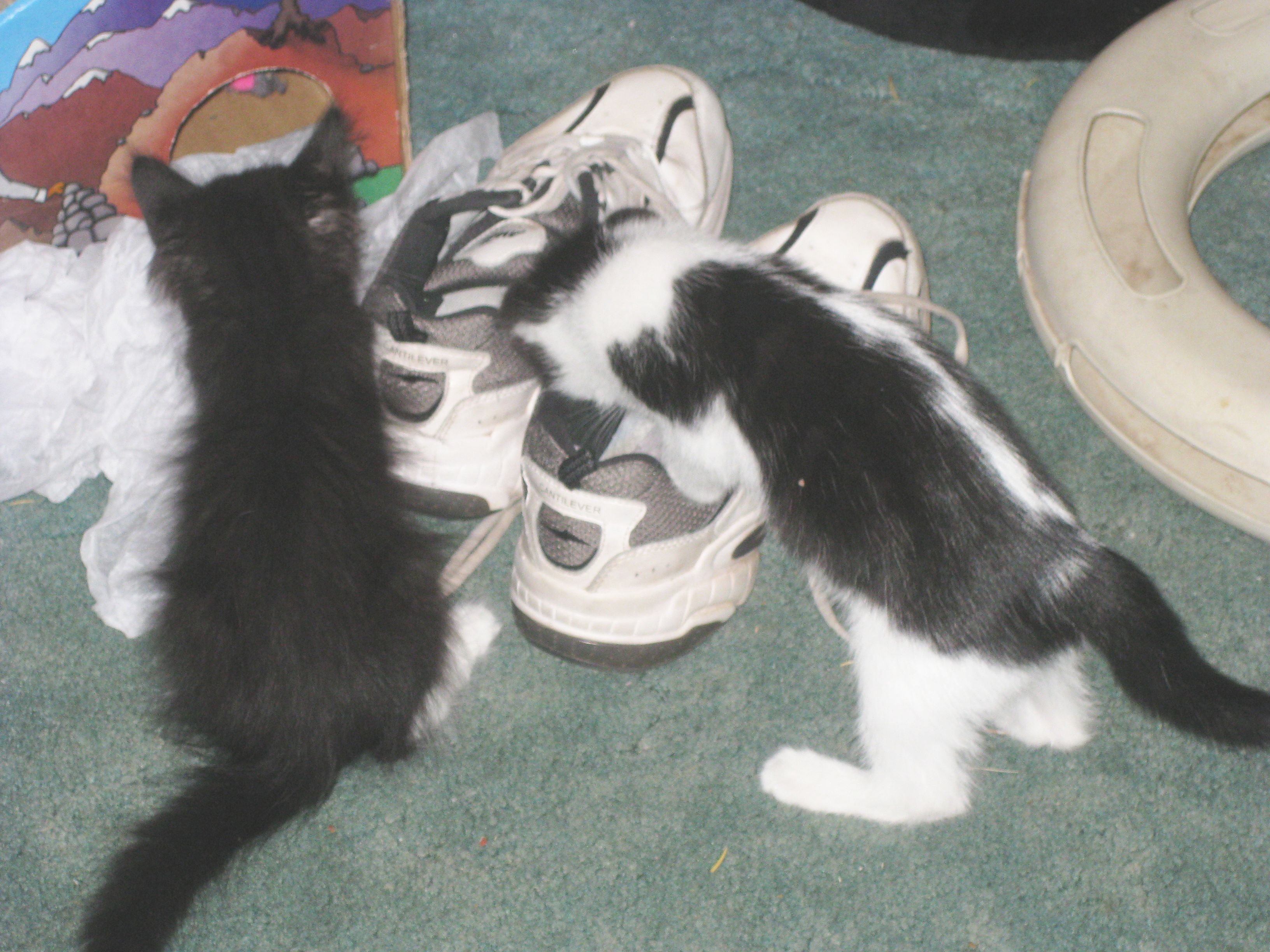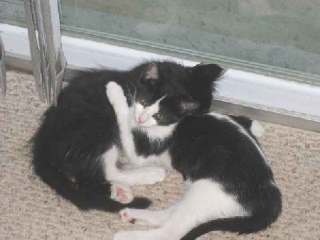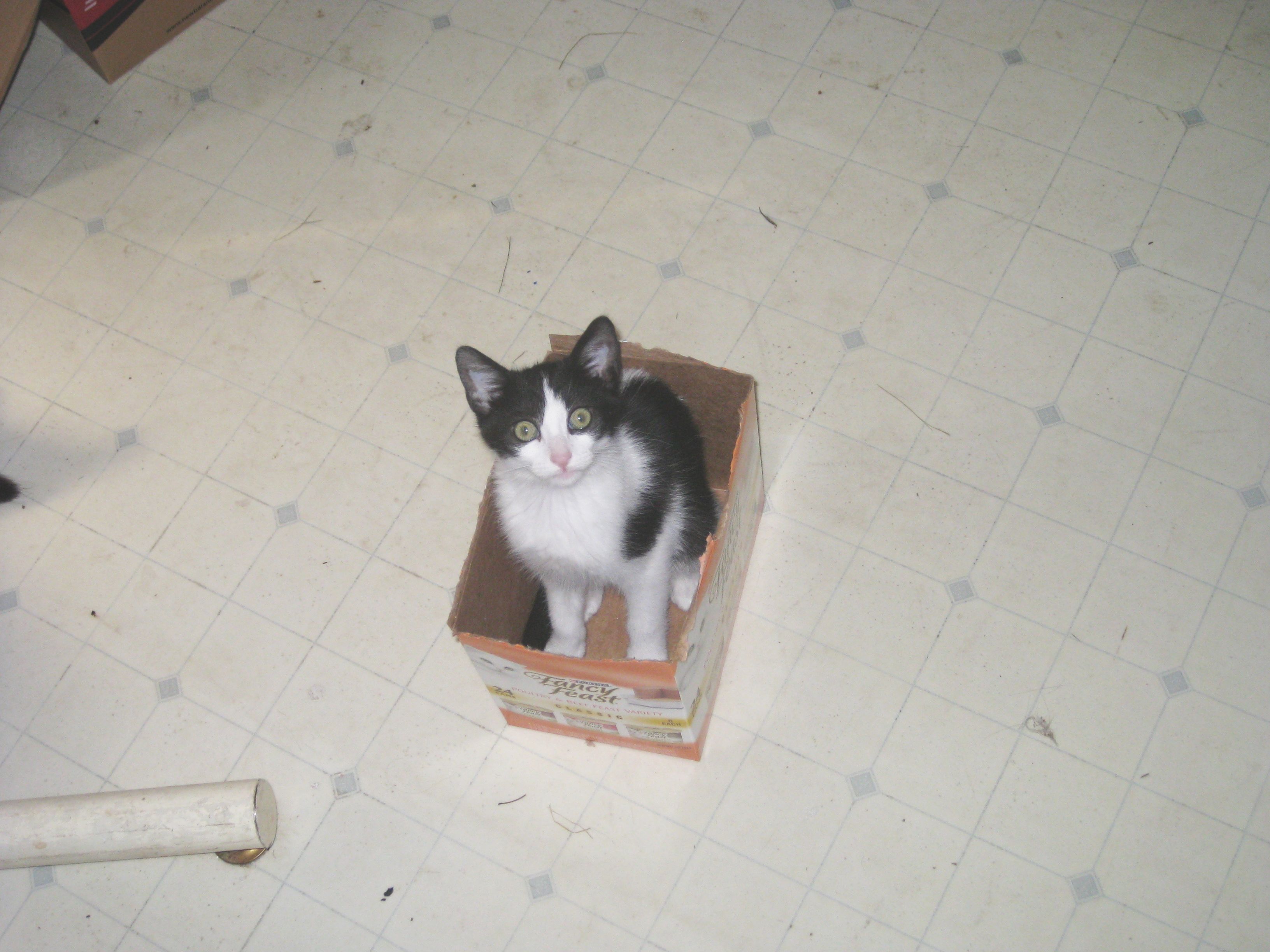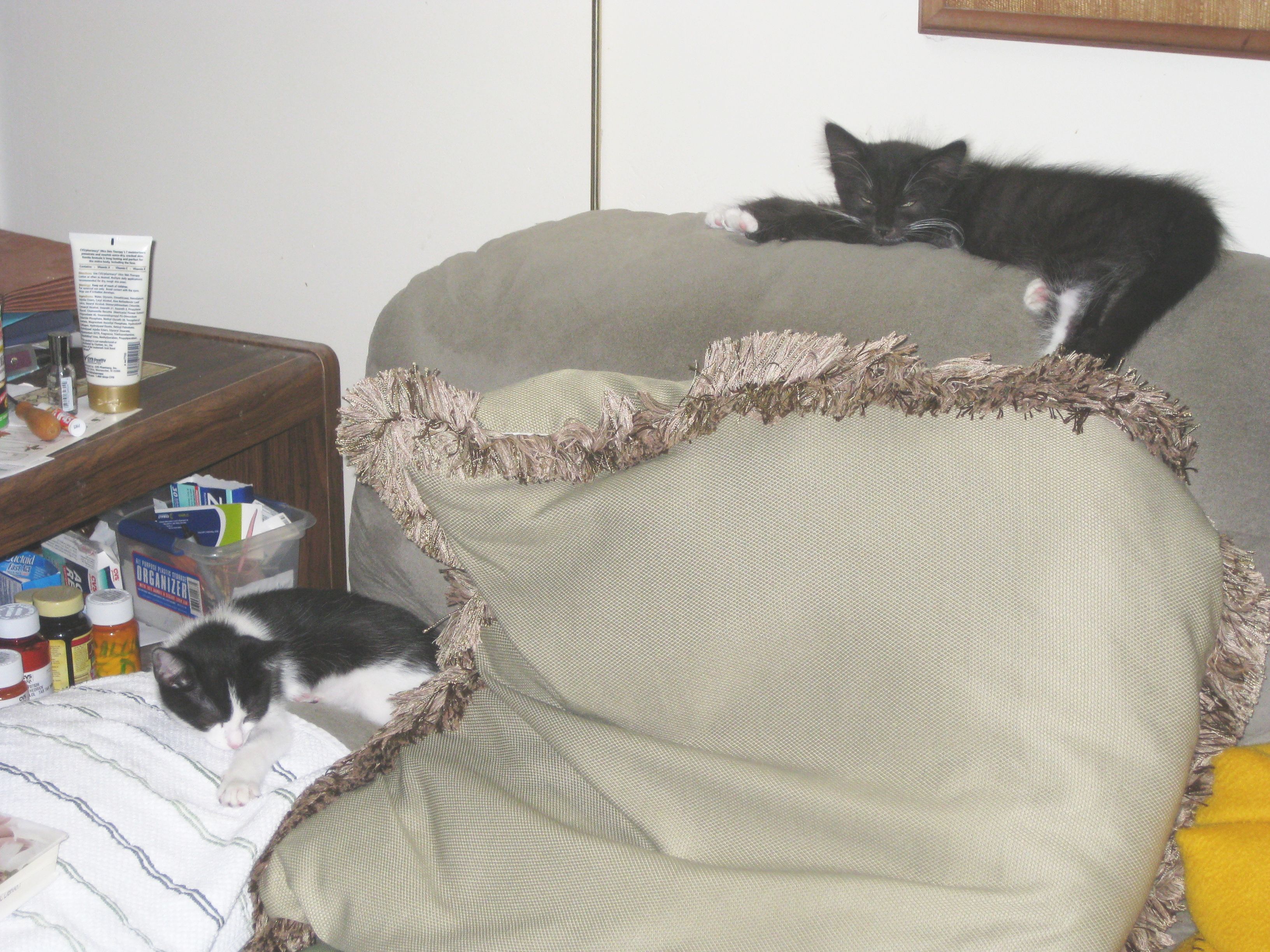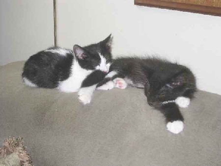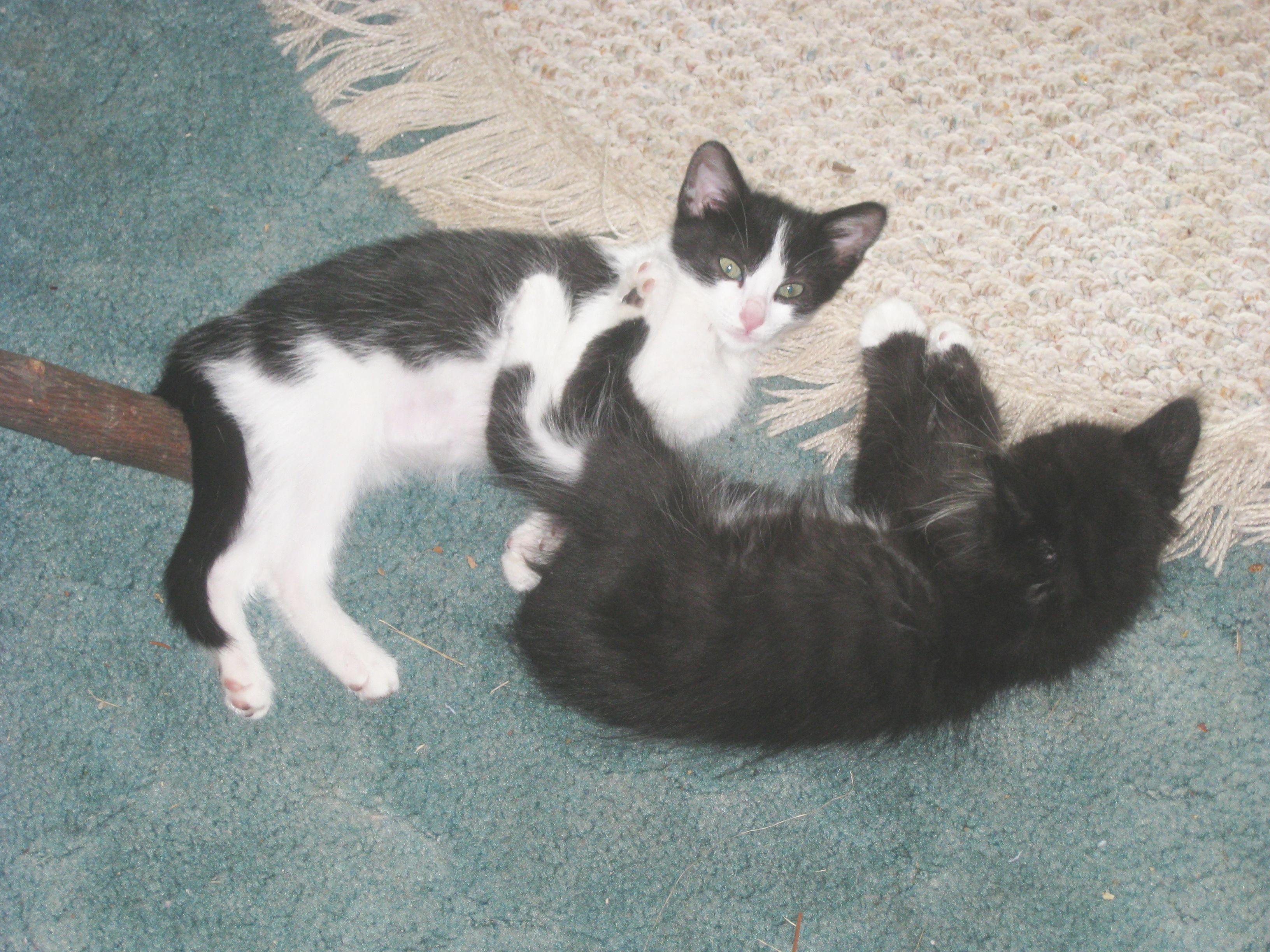 Selma is the, mostly, black cat. She was the "runt" of the litter. They are litter mates. Selma has pretty much lost the "halo" of LONG fur, though you can still see in some of the pictures!! Pips has a lot more white, including a "SKUNK" stripe down her back! As she got older she decided that playing, and sleeping, in the tissue box wasn't enough, she pushed onto the floor and removed all the tissues! She's now to big to fit inside the box.
