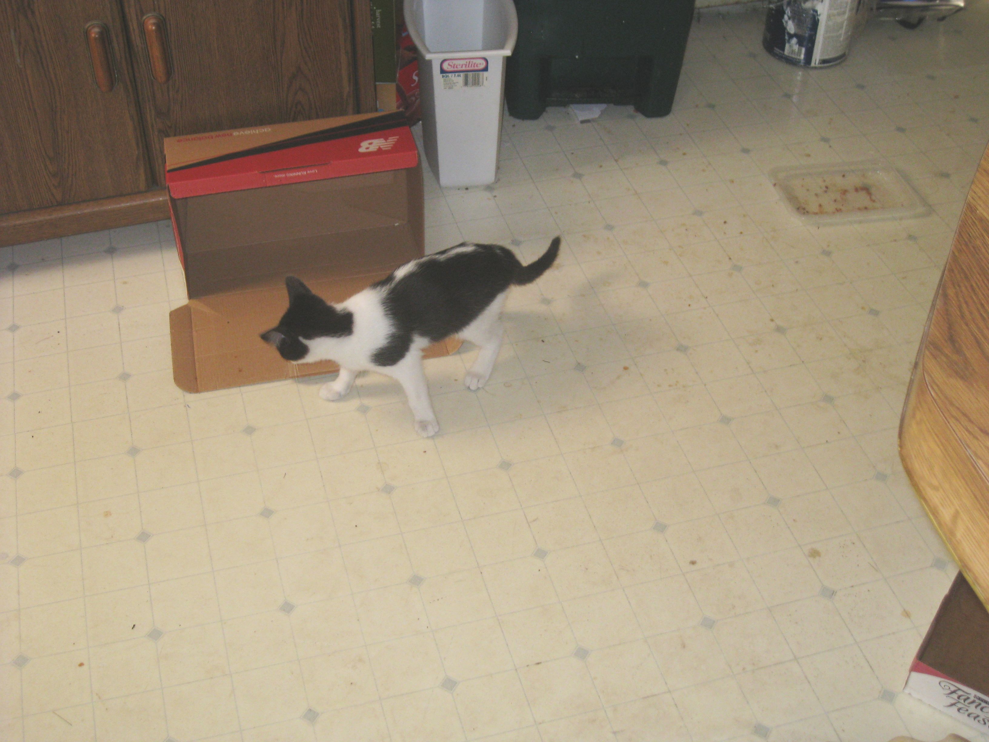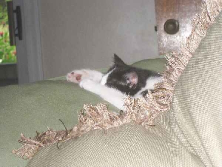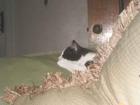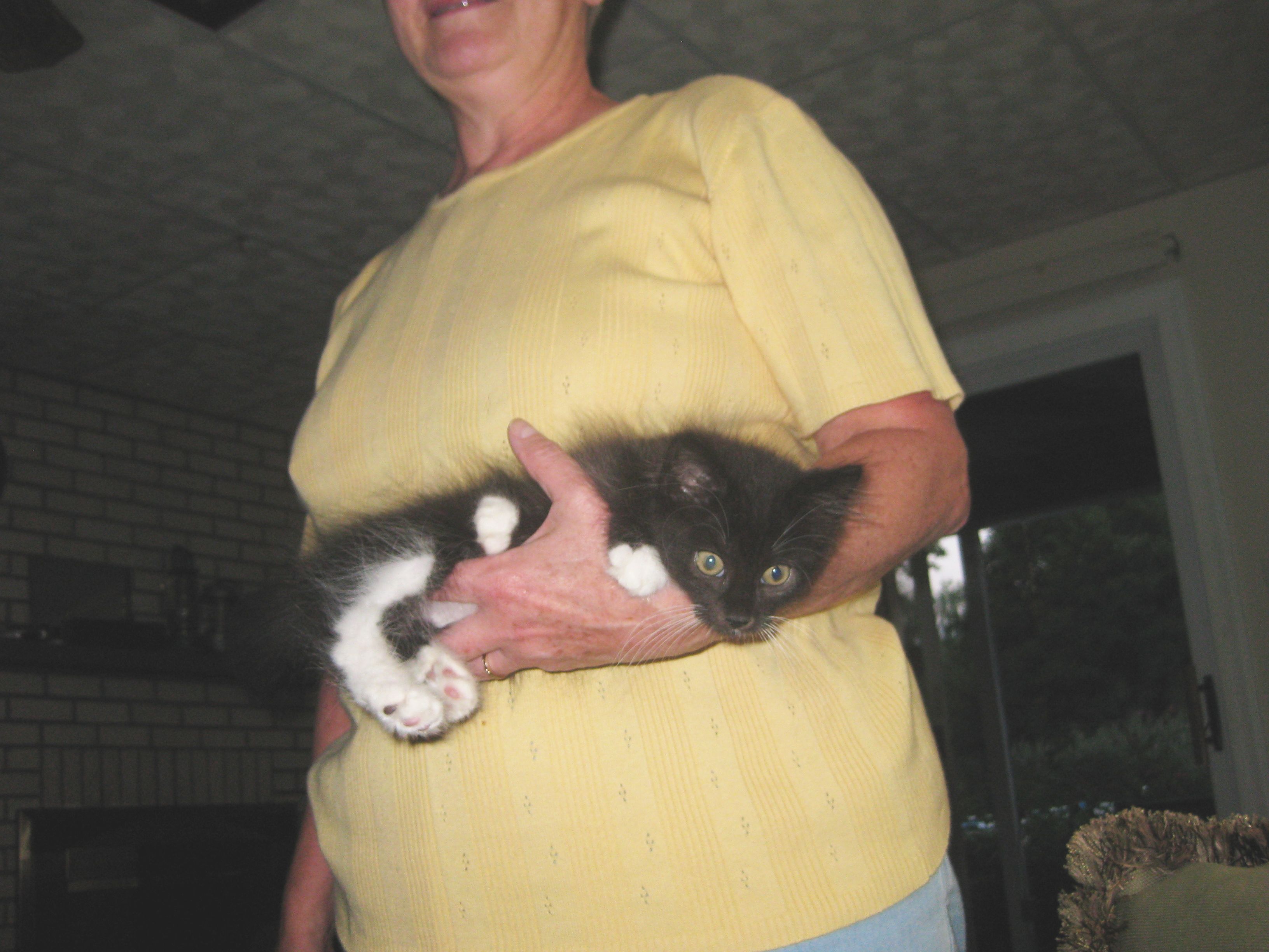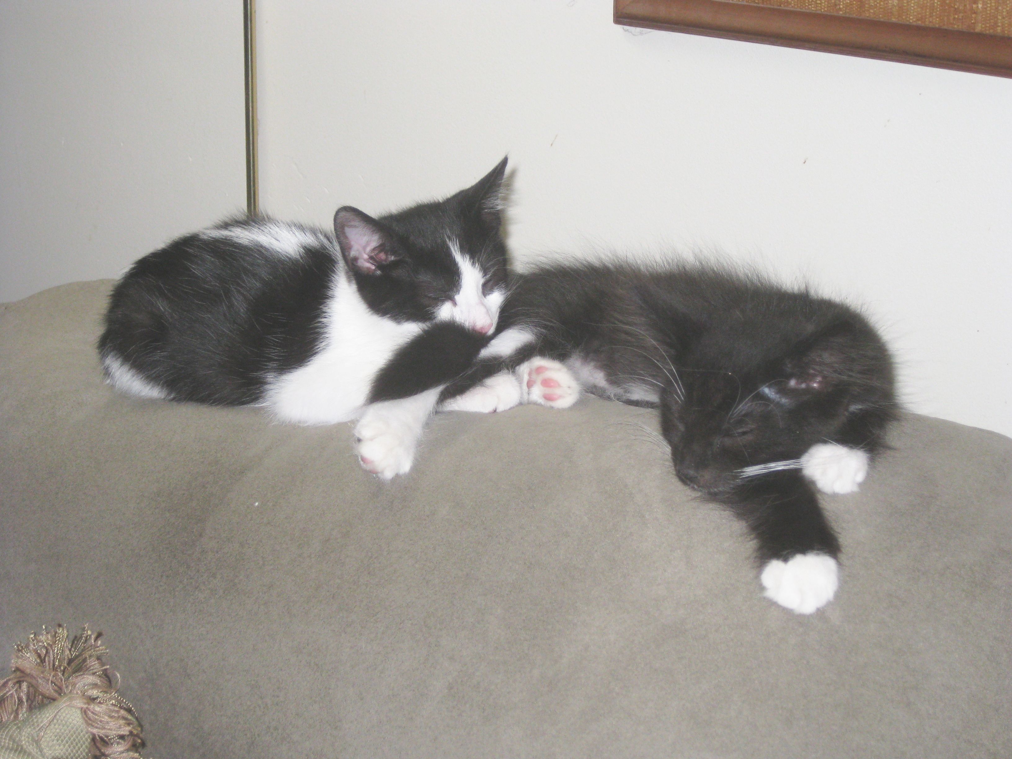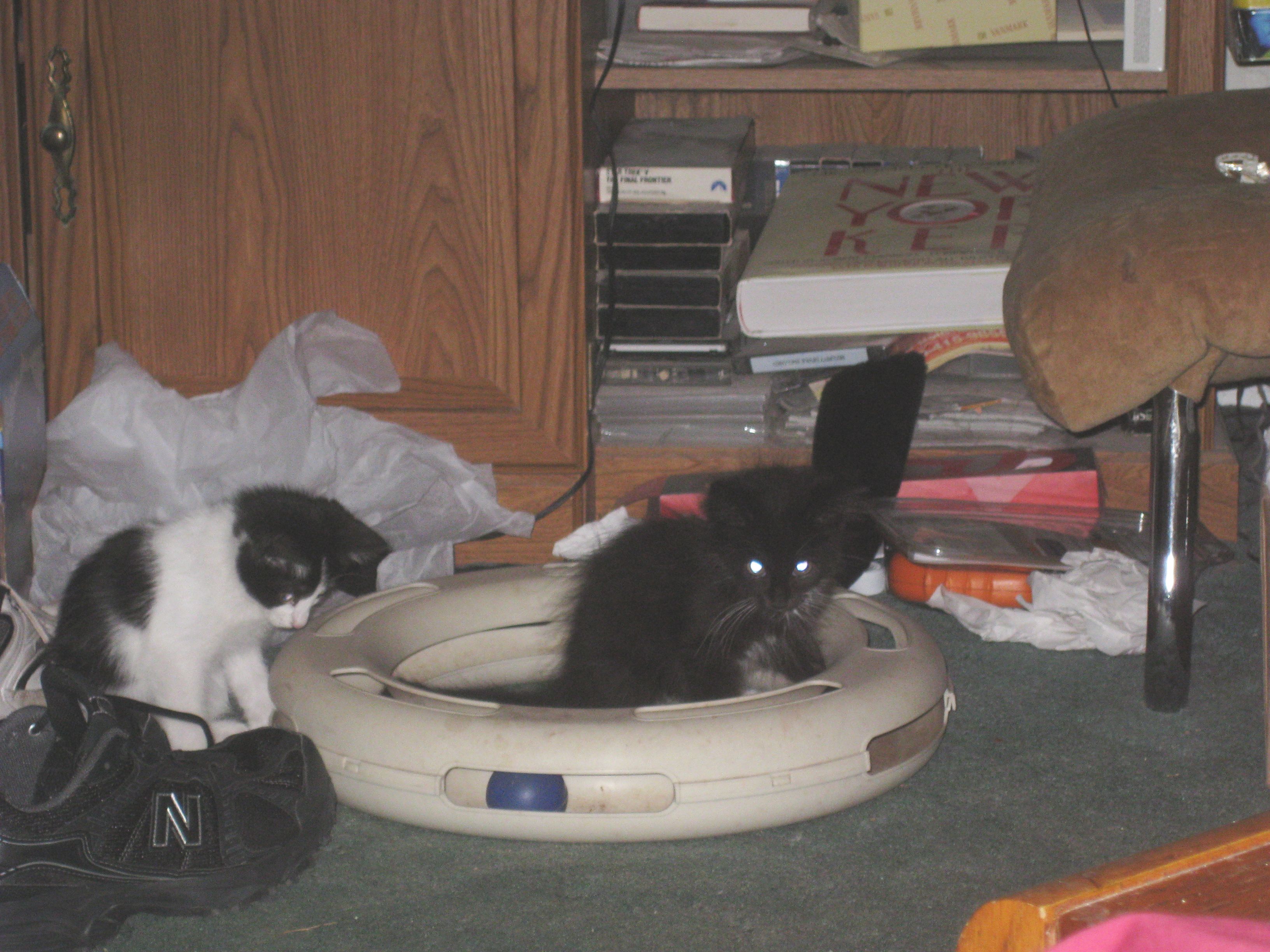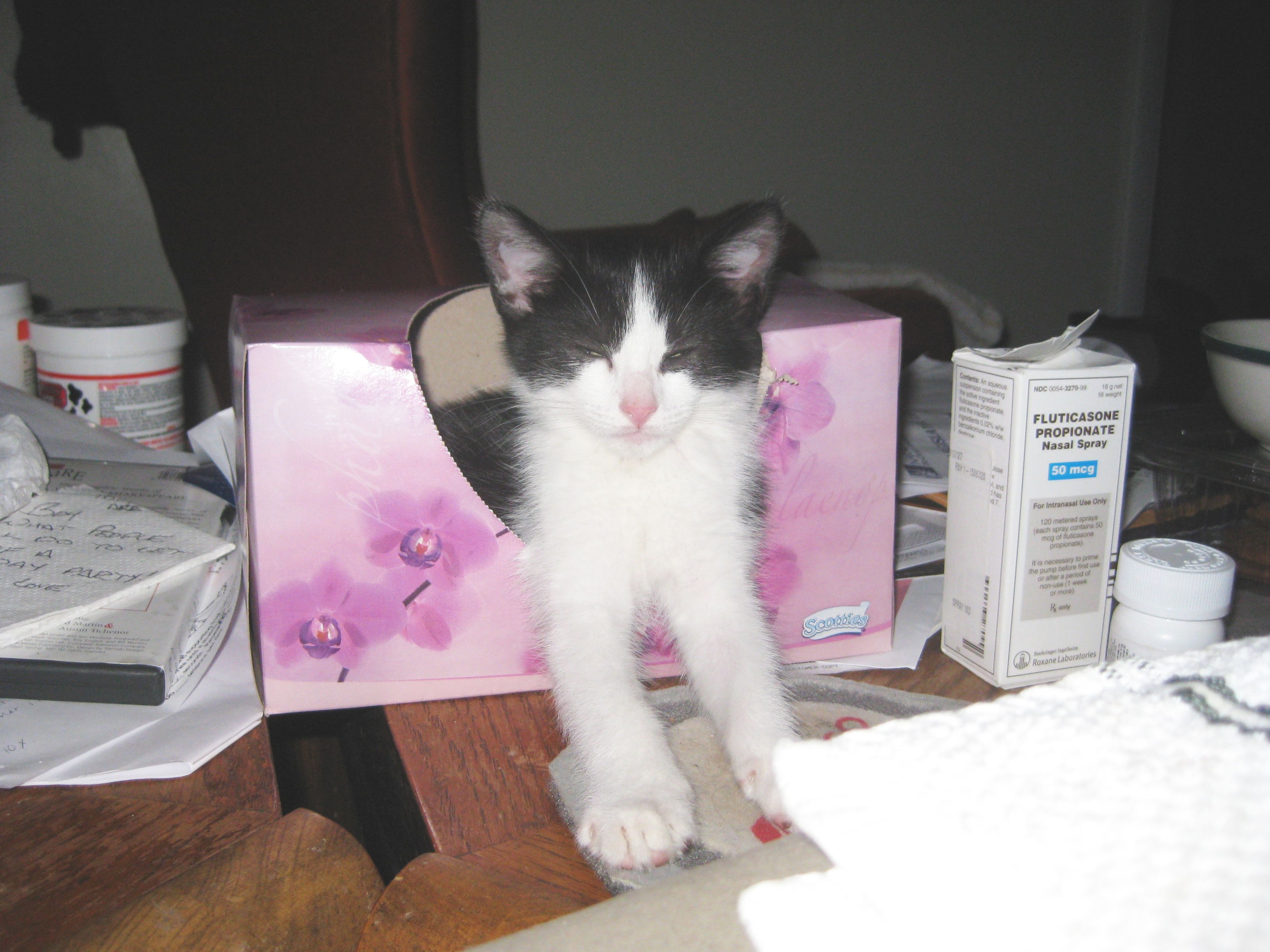 Selma is the, mostly, black cat. She was the "runt" of the litter. They are litter mates. Selma has pretty much lost the "halo" of LONG fur, though you can still see in some of the pictures!! Pips has a lot more white, including a "SKUNK" stripe down her back! As she got older she decided that playing, and sleeping, in the tissue box wasn't enough, she pushed onto the floor and removed all the tissues! She's now to big to fit inside the box.