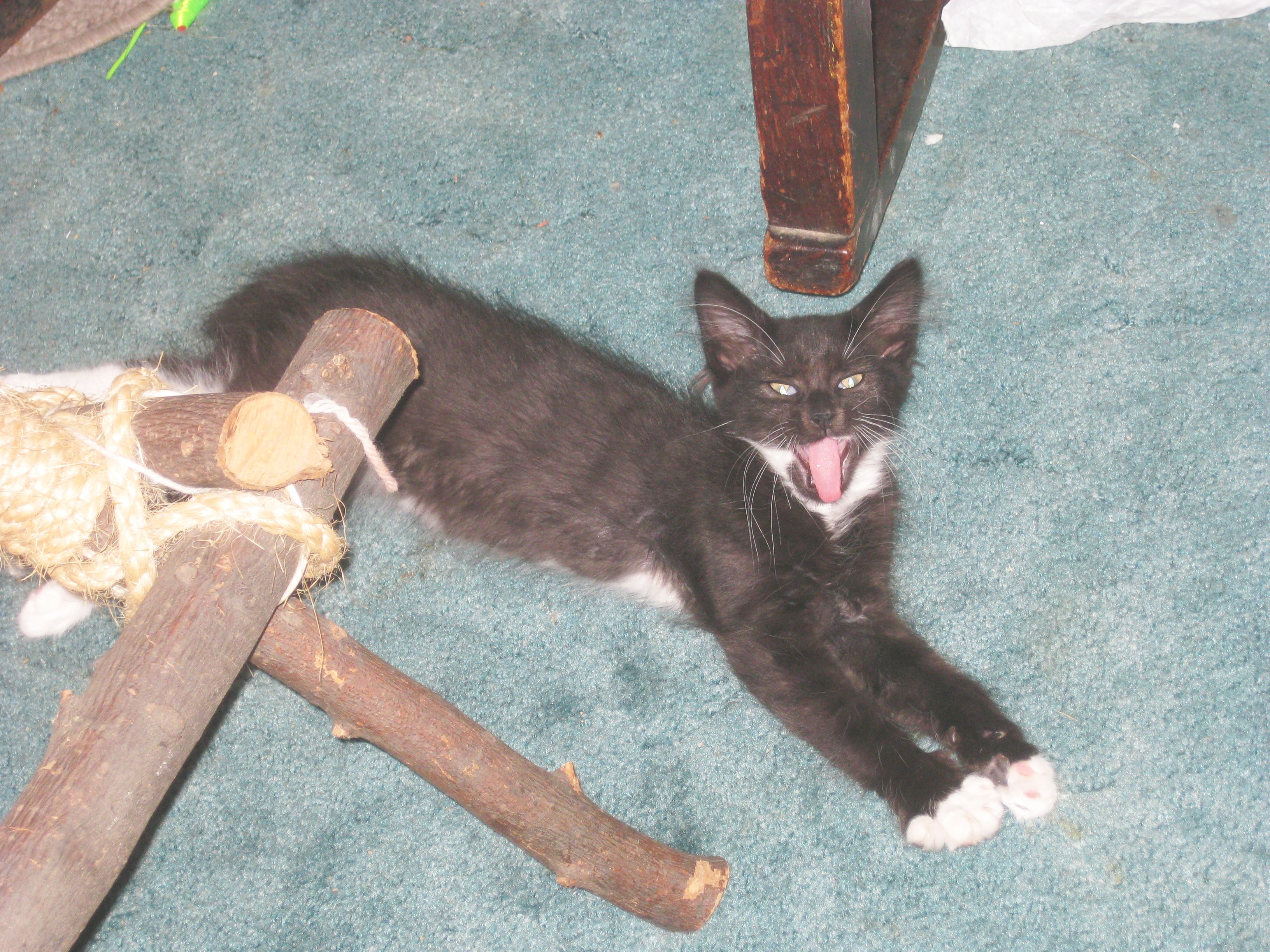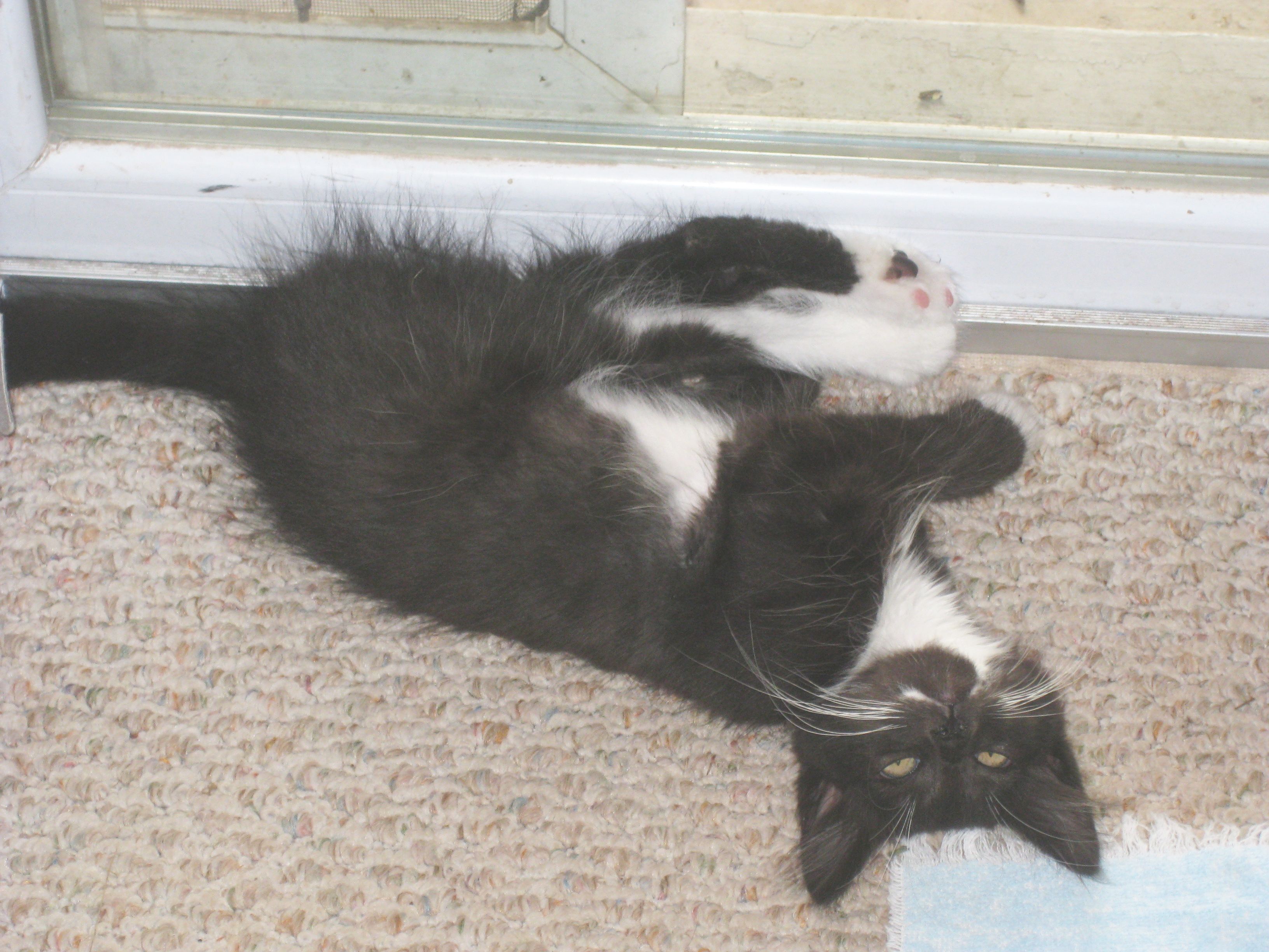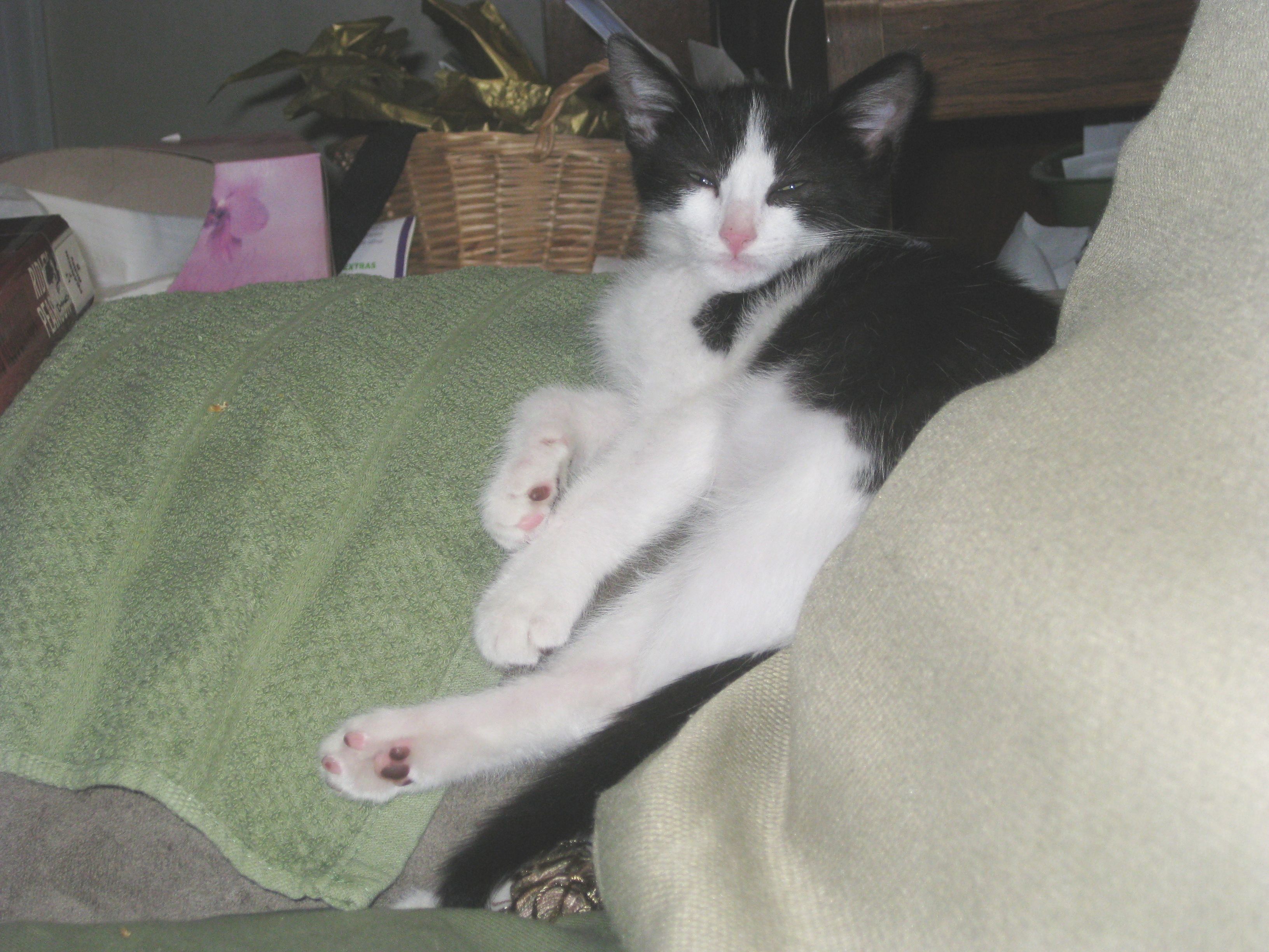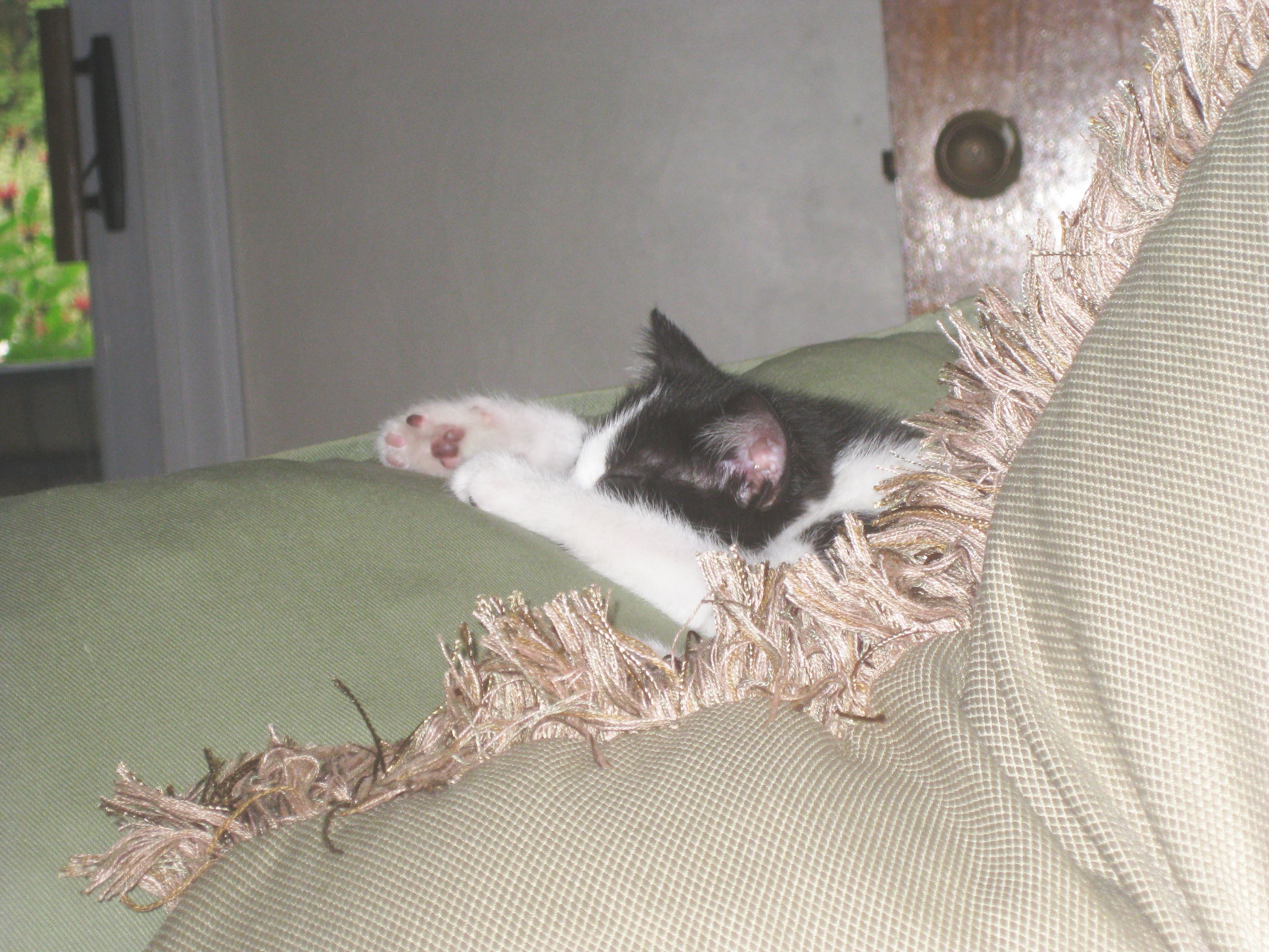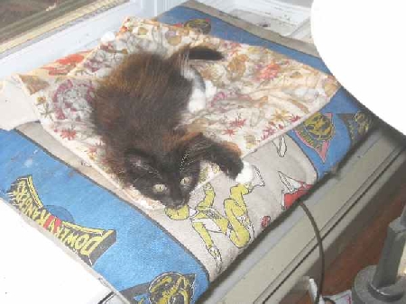 Selma is the, mostly, black cat. She was the "runt" of the litter. They are litter mates. Selma has pretty much lost the "halo" of LONG fur, though you can still see in some of the pictures!! Pips has a lot more white, including a "SKUNK" stripe down her back! As she got older she decided that playing, and sleeping, in the tissue box wasn't enough, she pushed onto the floor and removed all the tissues! She's now to big to fit inside the box.