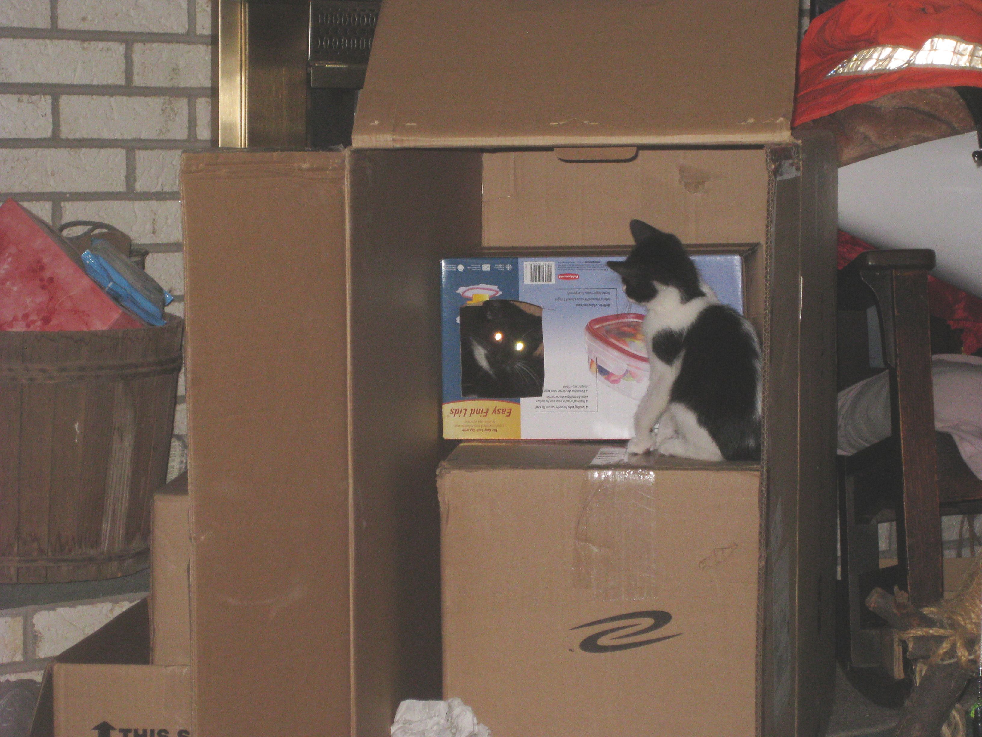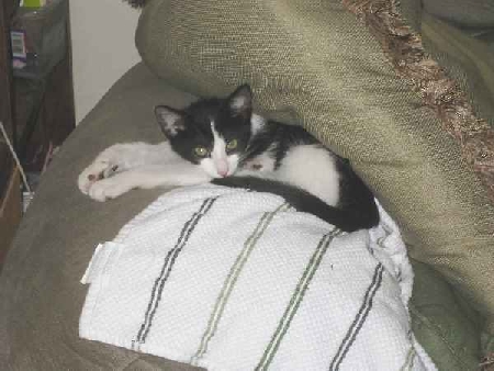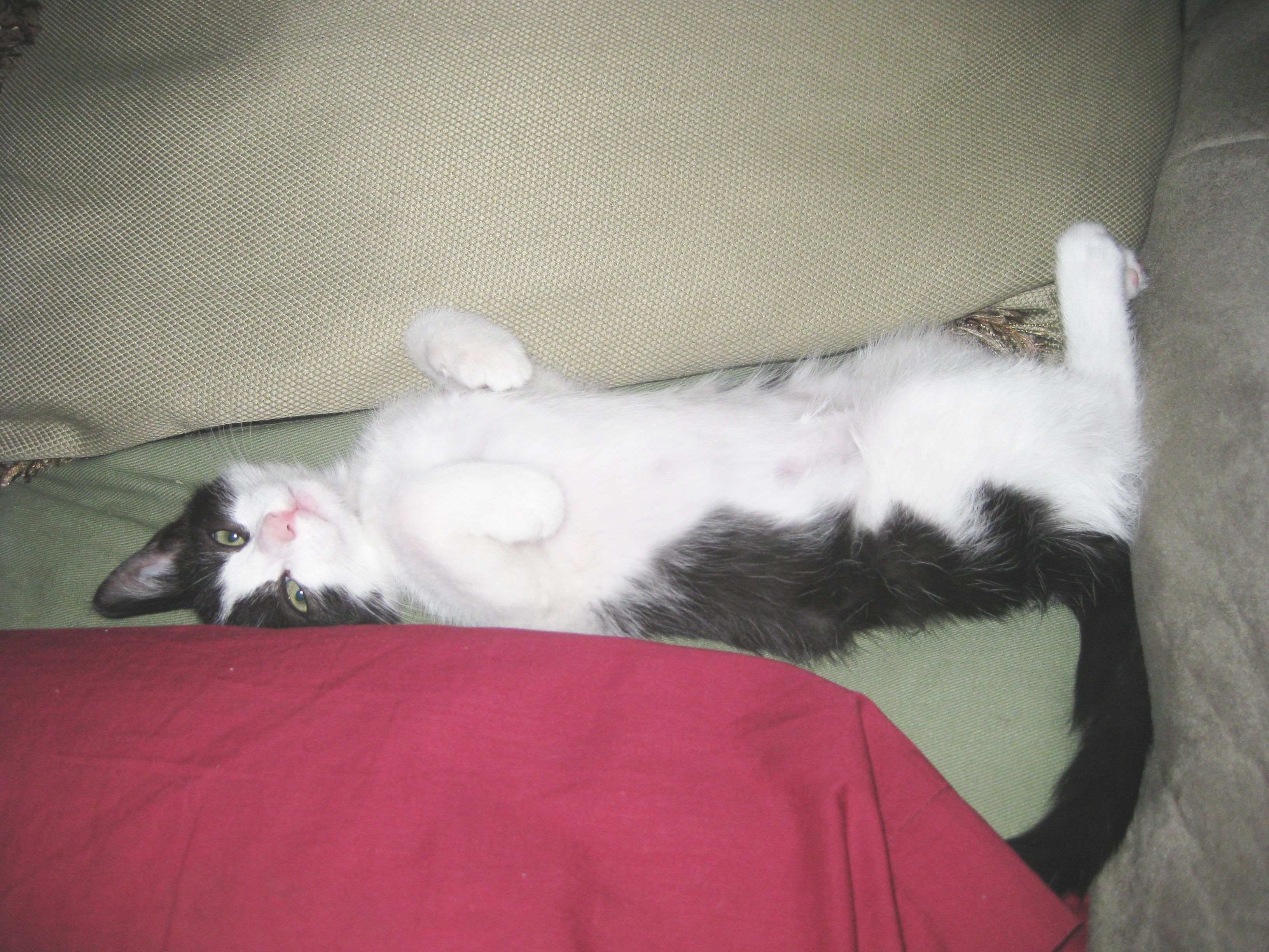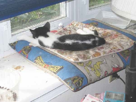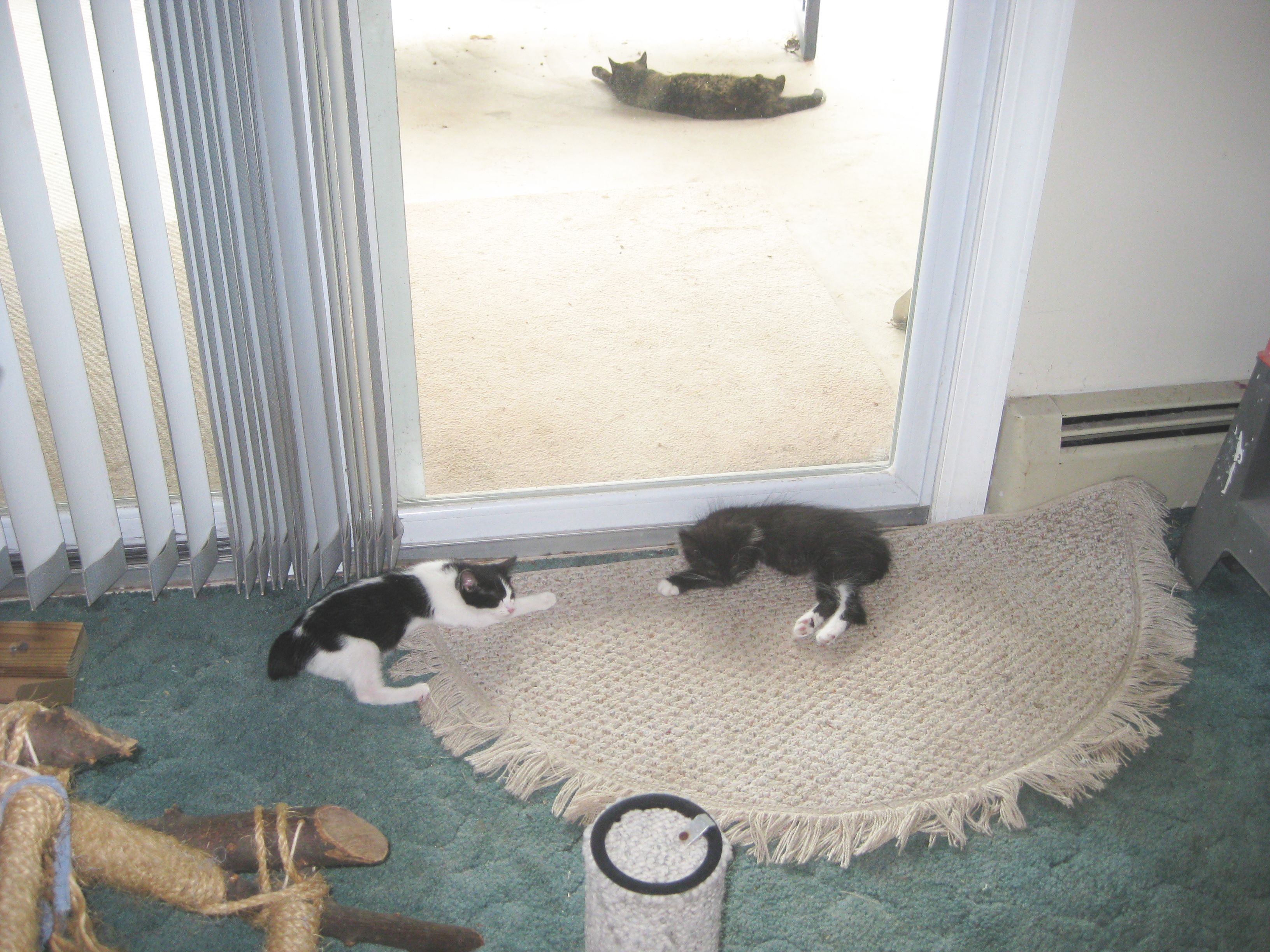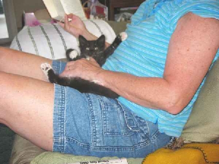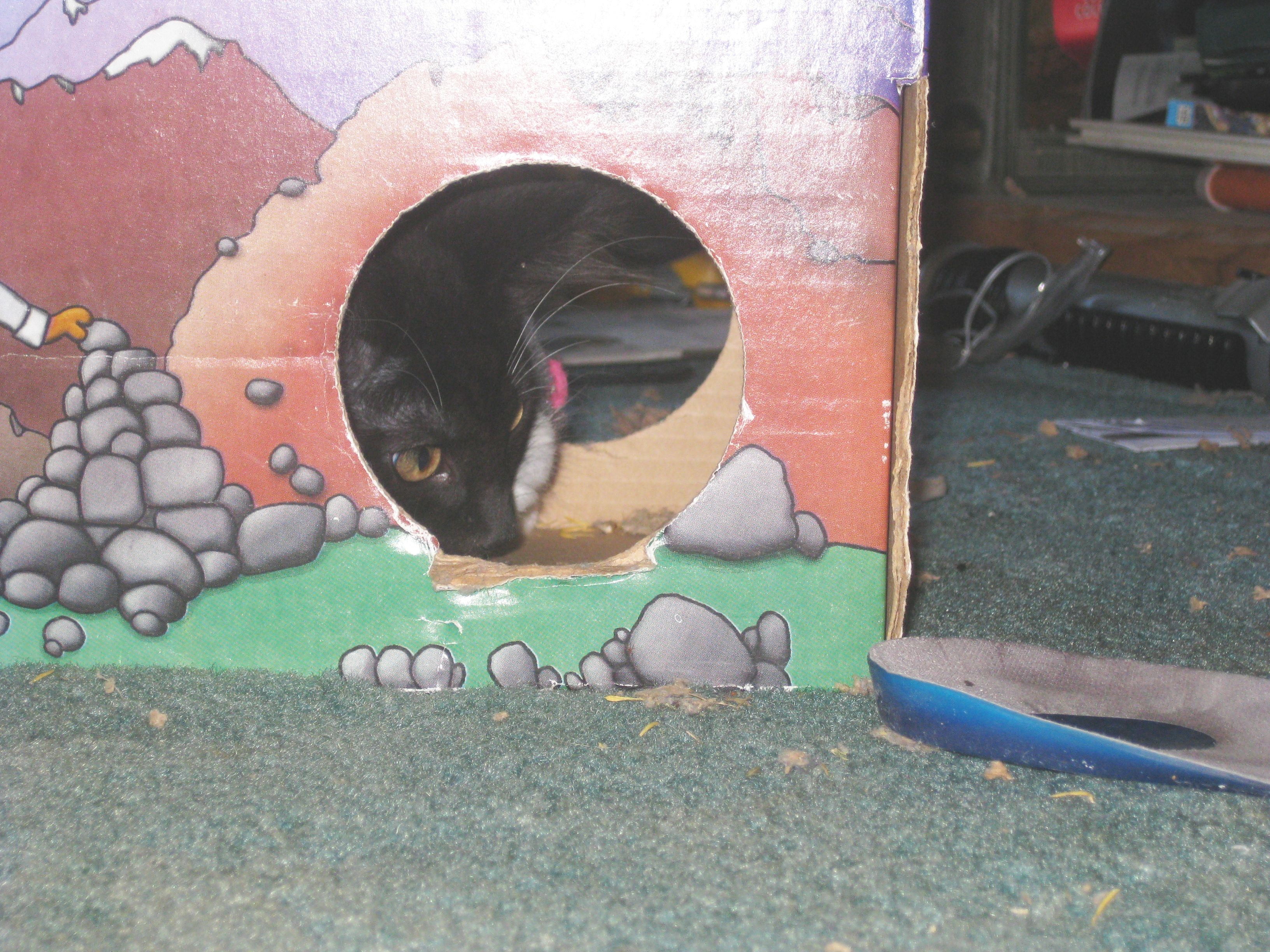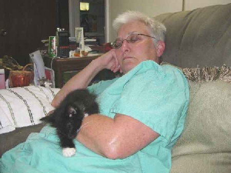 Selma is the, mostly, black cat. She was the "runt" of the litter. They are litter mates. Selma has pretty much lost the "halo" of LONG fur, though you can still see in some of the pictures!! Pips has a lot more white, including a "SKUNK" stripe down her back! As she got older she decided that playing, and sleeping, in the tissue box wasn't enough, she pushed onto the floor and removed all the tissues! She's now to big to fit inside the box.
