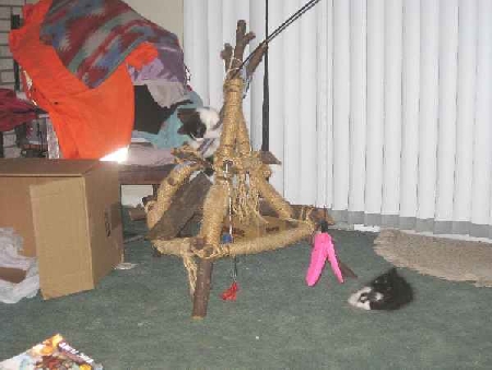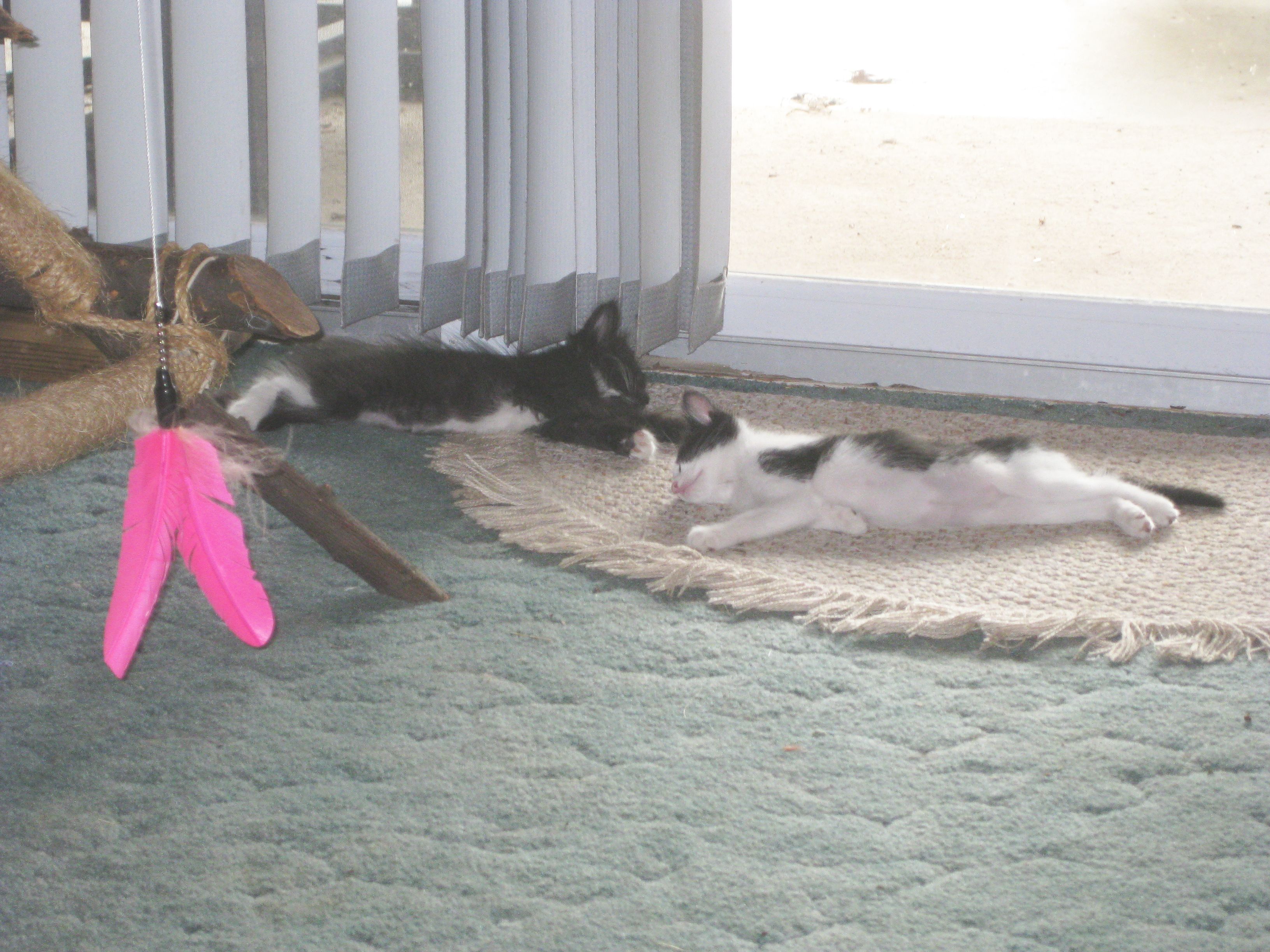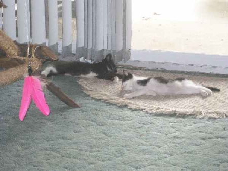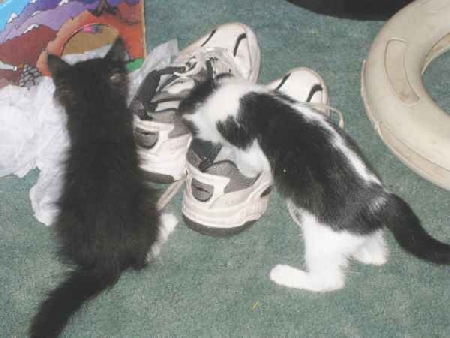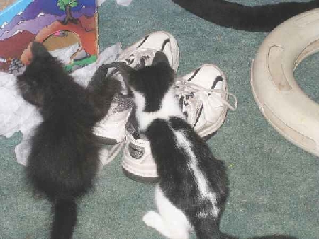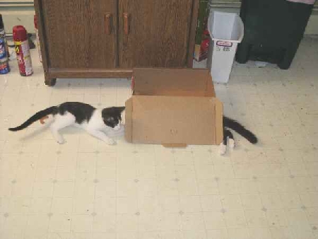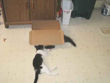 They both LOVE boxes!!! Put a new box down and they go sit and attack!! Pips has a couple of favorite, for now, toys that she carries all over the house. She has an orange "mouse" that we will find upstairs, downstairs, and in their dry food bowl! I removed it from the bowl one time and threw back into the family room. A couple of hours later it was back in the bowl!